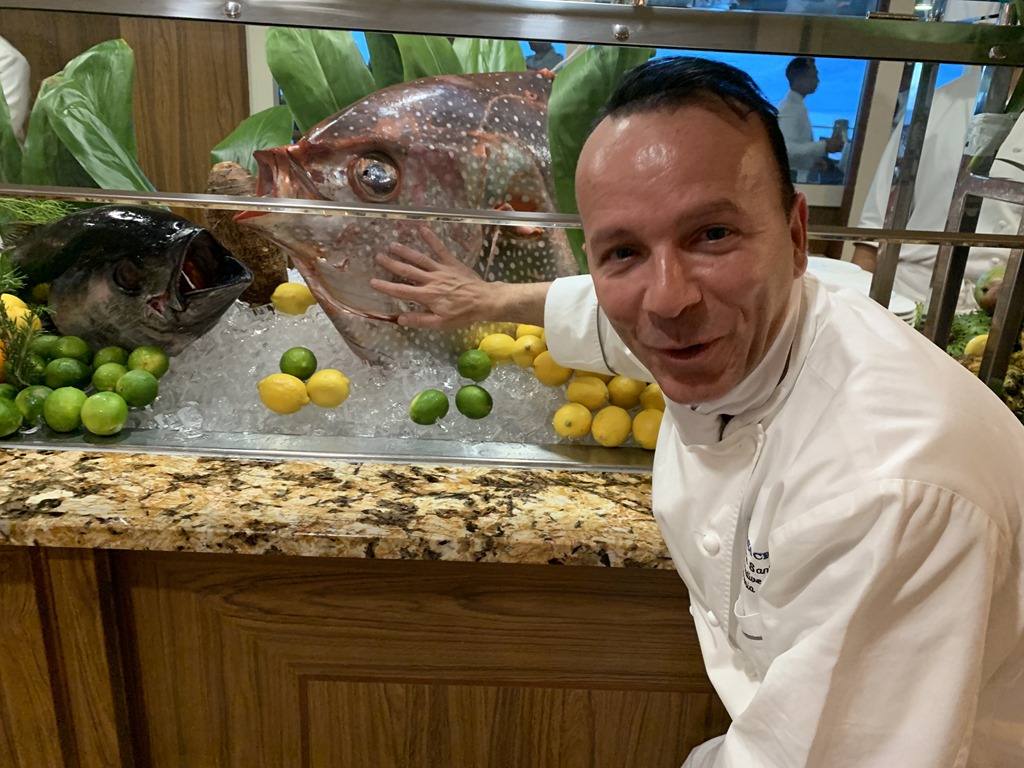 We heard that our executive chef, Mario, had bought some fresh fish in the Honolulu markets so we went to the Terrace Café for dinner.  Mario and some of the other chefs were grilling fresh tuna out on the Terrace.  And it was delicious.  He was also quite proud of the display of the tuna and the opah (moonfish) which is a native Hawaiian fish. We will have the opah on Thursday.