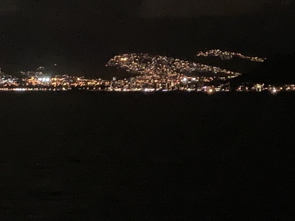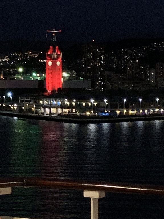 Here is the clock tower and the lights on the hills as we left the Honolulu harbor on Wednesday.