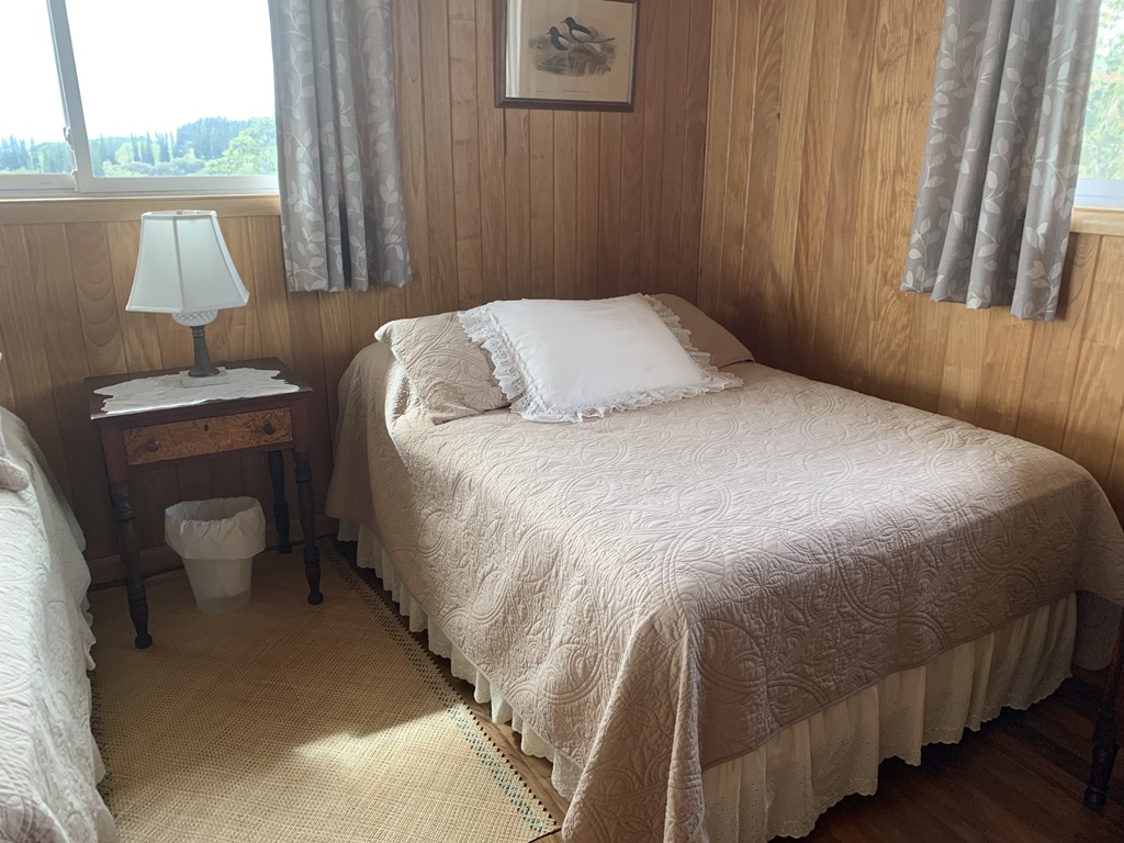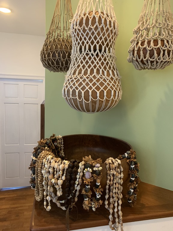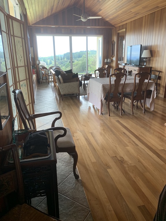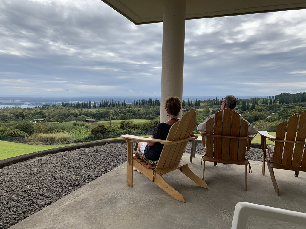 Our first home is owned by Beverly, a former chip designer in Silicon Valley.  She retired here and bought 20 acres of absolutely beautiful land overlooking the ocean.  There is no possibility of anyone building to block her view.  She designed the home and every room has a view of either the ocean or the mountains and is constructed inside and out of native Hawaiian wood.