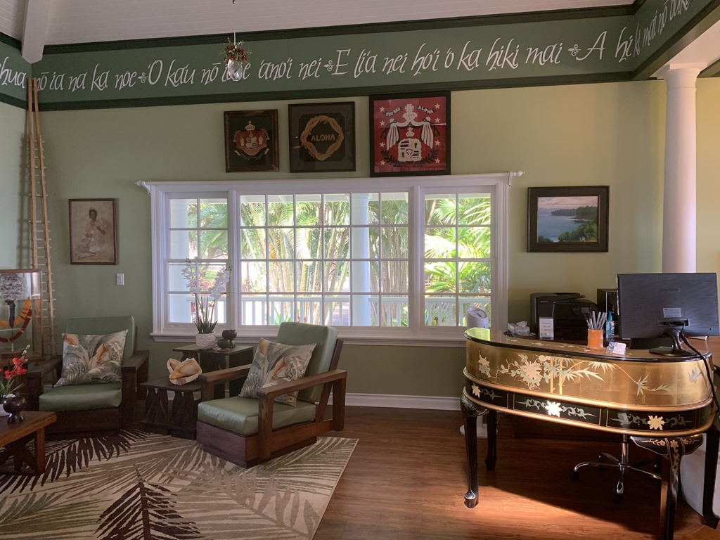 We moved on to the second house, a bed and breakfast called The Palms Cliff House Inn (which, by the way, is for sale).  On the way, our driver/guide Lisa gave us some information about Hilo and the Big Island of Hawaii.  There are no snakes here, also no squirrels, skunks or raccoons.  They do have rats which came from some of the ships originally, and they introduced mongoose to catch the rats.  Unfortunately one is nocturnal and the other is not so they actually co-exist quite well.  Another unintended consequence of human intervention!