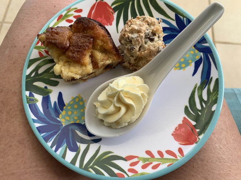 Here’s our breakfast.  Pure Kona coffee (costs up to $50/pound).  Most coffee labeled Kona has only a small percentage of Kona beans.  We could add Bailey’s or Kahlua, cane sugar and whipped cream. We had a small glass of guava juice, banana macadamia bread, chocolate expresso/coffee bread, a taro doughnut – malasada (my favorite) and homemade sausage.