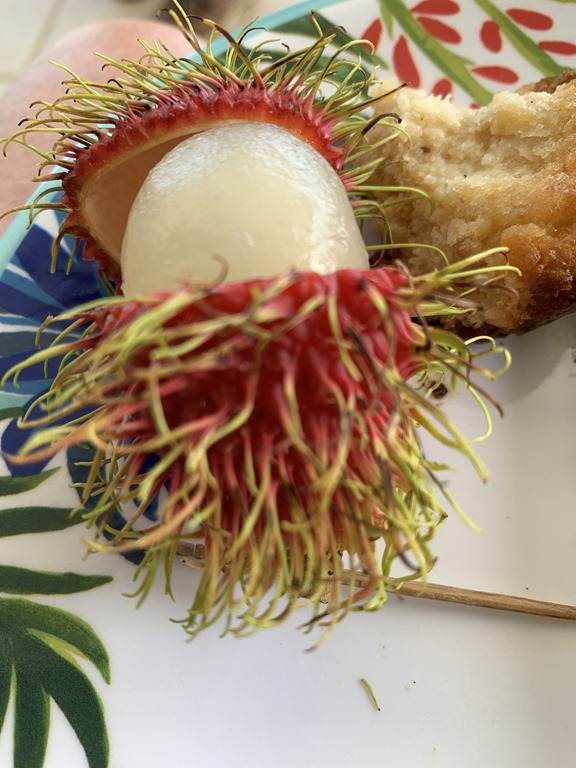 Here we had a bread pudding, a coconut macaroon, lilikoi (passion fruit) mousse, apple banana, fresh pineapple and this fruit called rambutan. The part you eat is inside that fuzzy stuff and it is much like lychee.