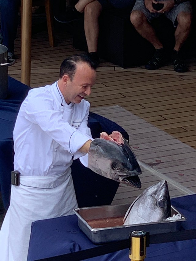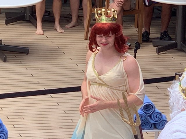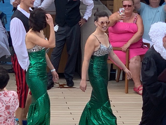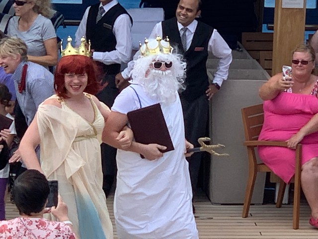 Here the women of the entertainment team, Stephanie and Sophia, get initiated. The initiation involves kissing the fish and being doused with something. The passengers mostly got ice water but the staff members got raw eggs and pasta. Queen Neptuna was actually our assistant cruise director, Nieks, who had his boobs and wig removed to reveal his disguise!