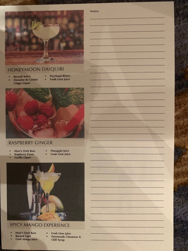 I am writing this on Monday, February 11. We attended another master class with Sebastien where he made the Honeymoon Daiquiri, Raspberry Ginger and the Spicy Mango Experience. We got to taste the Mango one. I will go to the cocktail school this afternoon too, where we will make 3 new drinks.