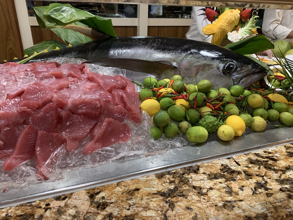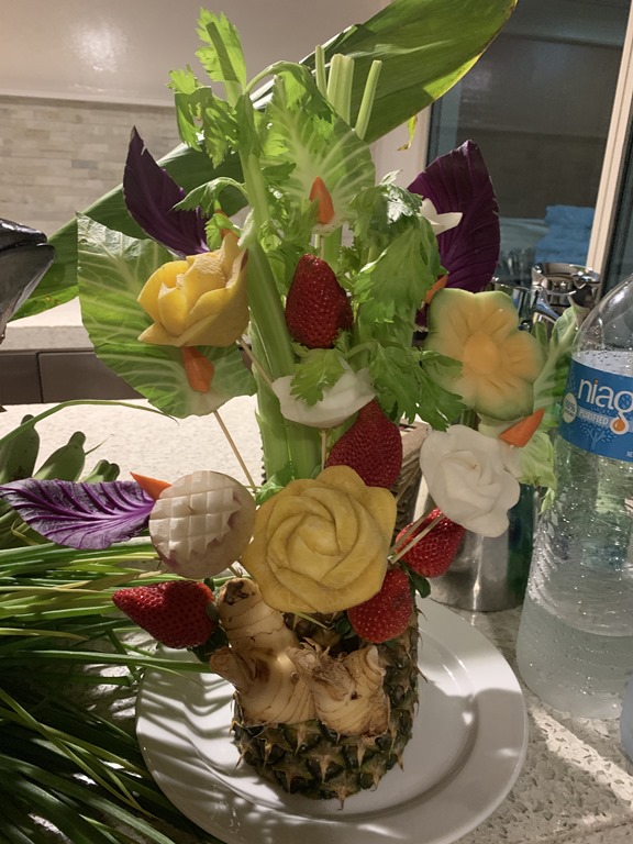 Last night we had another terrific fish dinner that was grilled on the outside deck at the Terrace Café. Mario was out getting fresh tuna (which he said you can tell it is good quality by checking the eyes of the fish). The displays of the carved vegetables are also beautiful. And the fruit that was brought on board was a delicious ending to the meal.