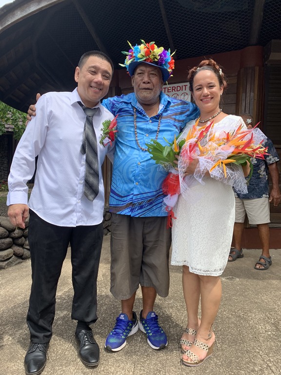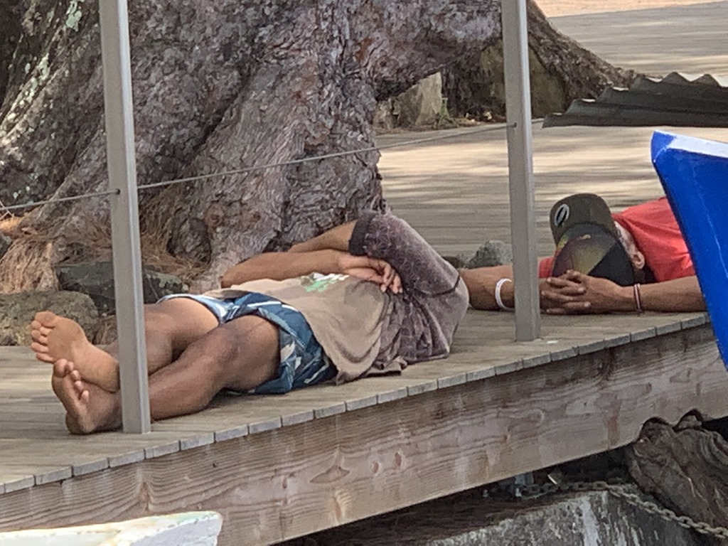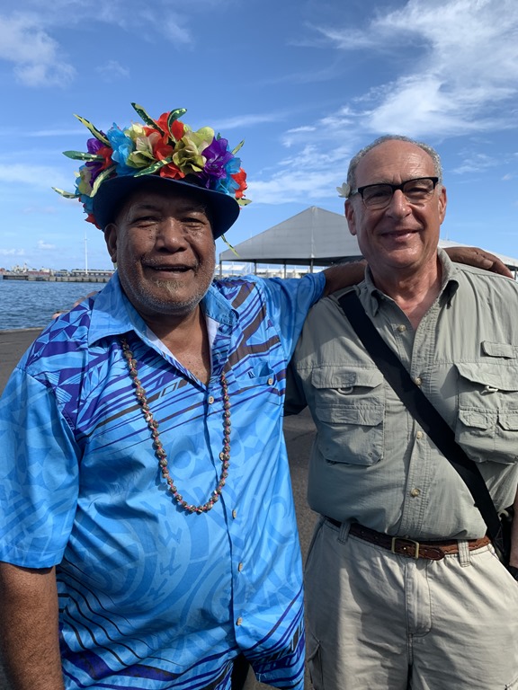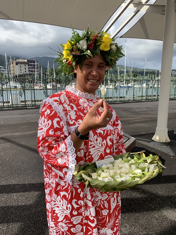 Today the weather was beautiful, hot but sunny and nice. We were greeted by local women who gave us one of the Tiare Tahiti local flowers to wear. Behind the left ear means we are unavailable! Other musicians played for us as we came ashore.
