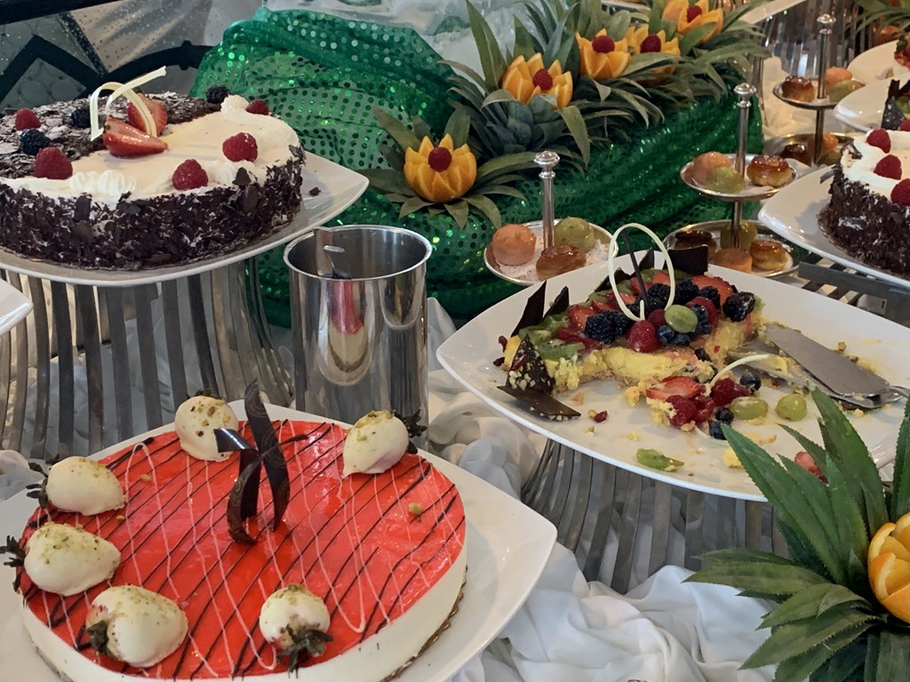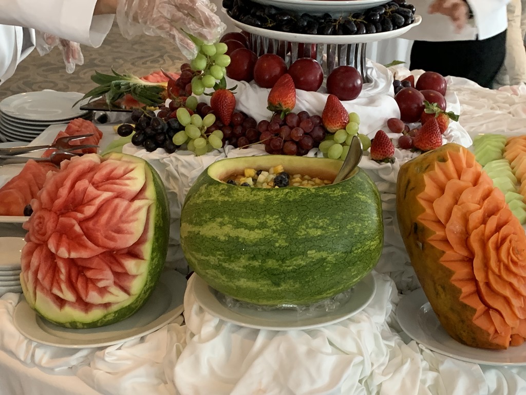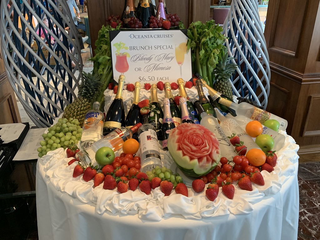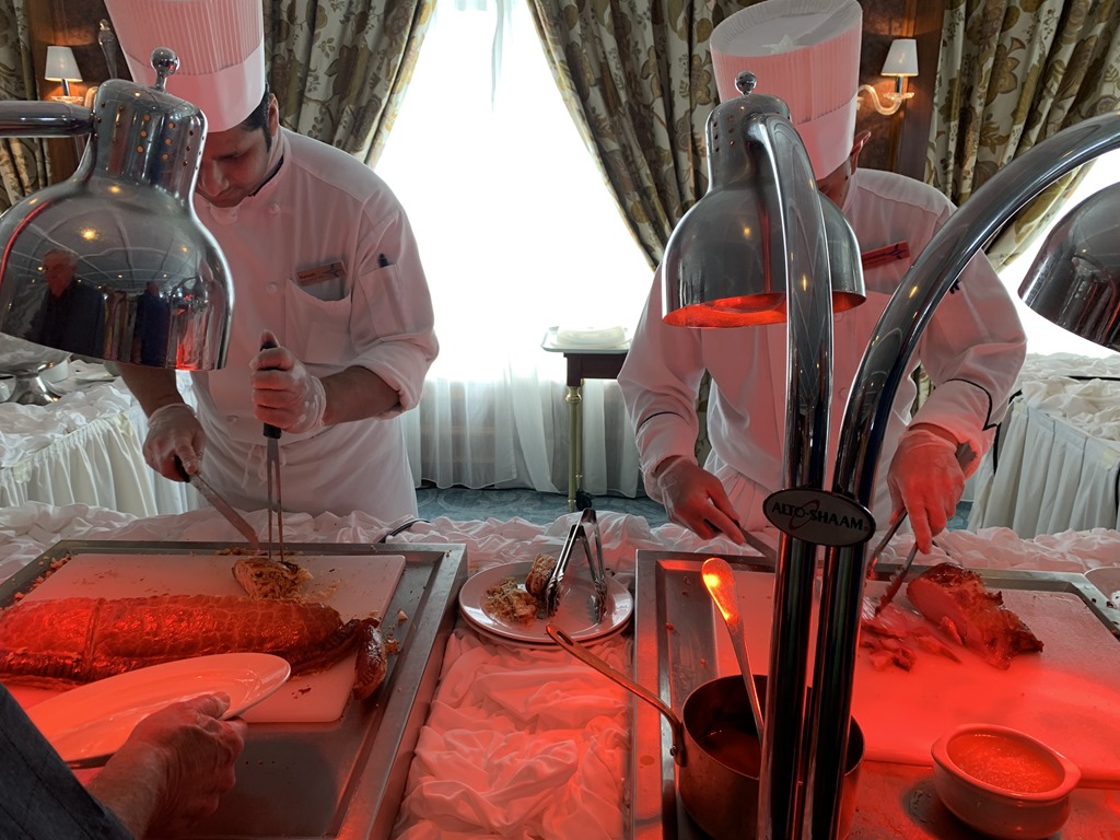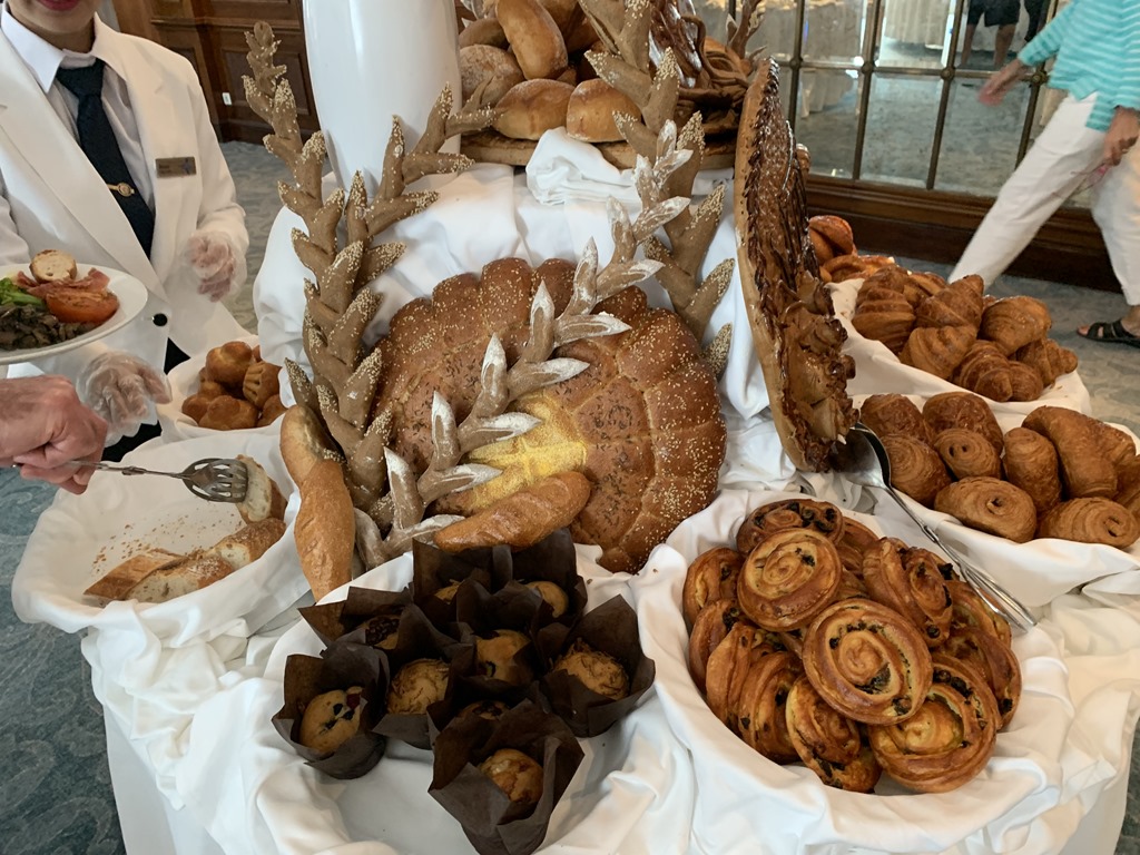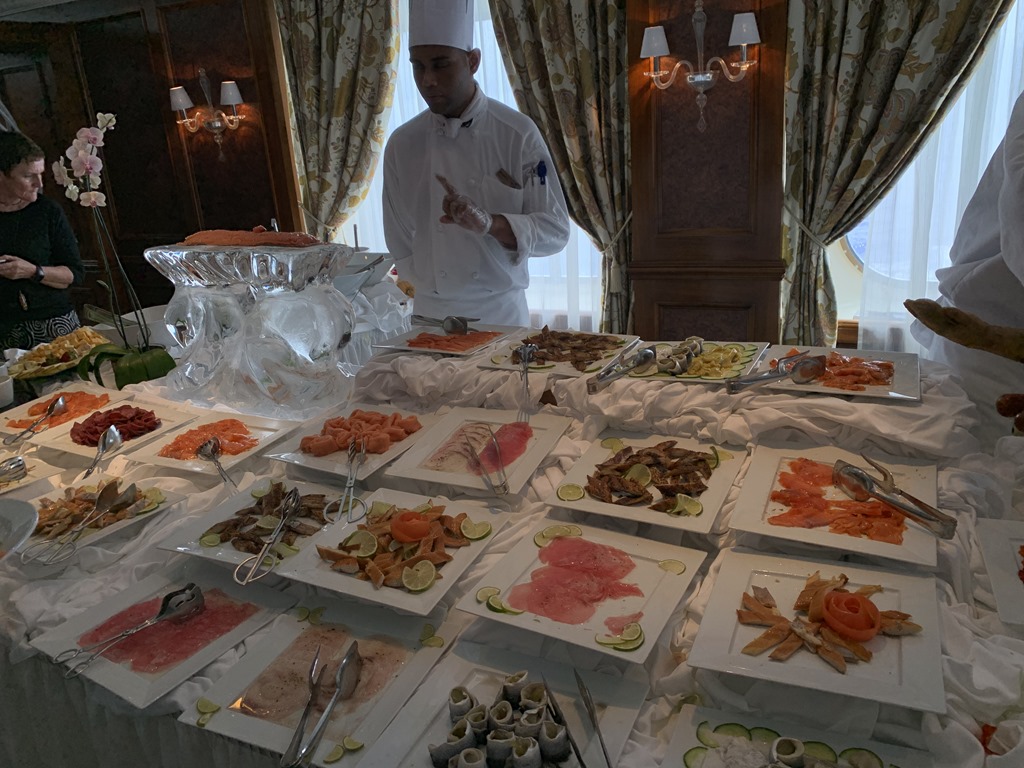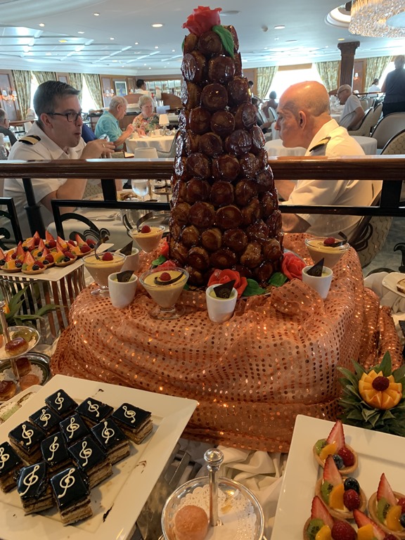 Yesterday we had the beautiful brunch that the chefs prepare several times during the 6 month voyage. Today was the first and as always, it was wonderful – both in taste and in appearance. You can order specialties from the menu or choose items from the buffet. Here are some pictures of the Grand Dining room feast. The delicacies are too numerous to mention!