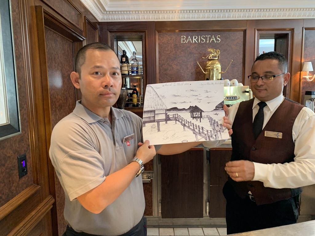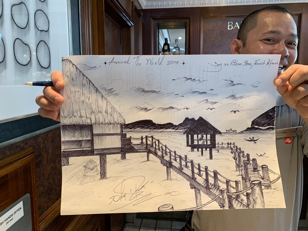 As we left the brunch, we saw one of the bar tenders at the coffee bar, Baristas. It turns out that he is a fabulous artist. He showed me his picture from Bora Bora, then he said he left out the Insignia in the picture, drew it in and I took another picture of him holding his masterpiece. He did this with a ball point pen! He drew the Insignia at the top right in the picture between the mountains.