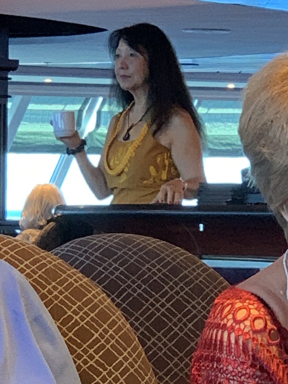 Our wonderful Polynesian enrichment lecturer, June Teruya, is on board until Tokyo. I took her classes on the last world cruise and she is just delightful. Today we made the woven lei. She gave us some history and described the correct way to gift someone with a lei. Then we all made one. They can also be made into hatbands.