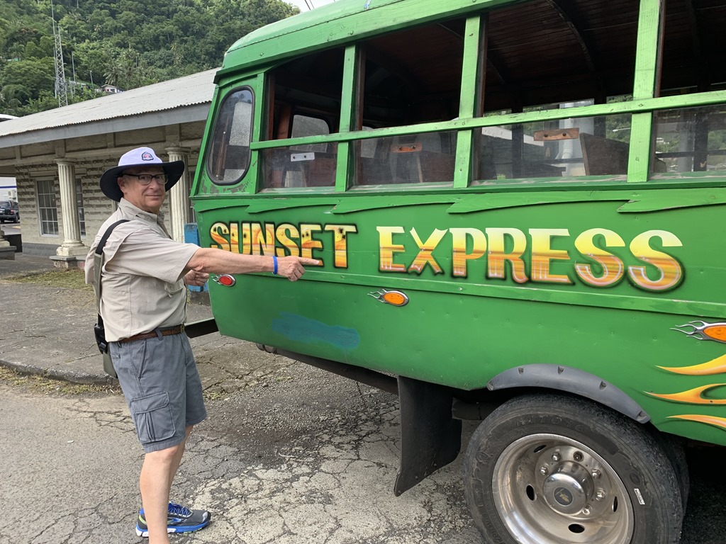 The road doesn’t go all the way around the island, so we went to the western area first, then went back to the eastern side before returning to the ship.  Jubilee wanted to take us up to a high point for some beautiful pictures of the landscape, but part way up, the bus started to overheat, so we didn’t do that.  By the way, these very interesting buses don’t have air conditioning, but the breeze once we travel makes them quite comfortable.