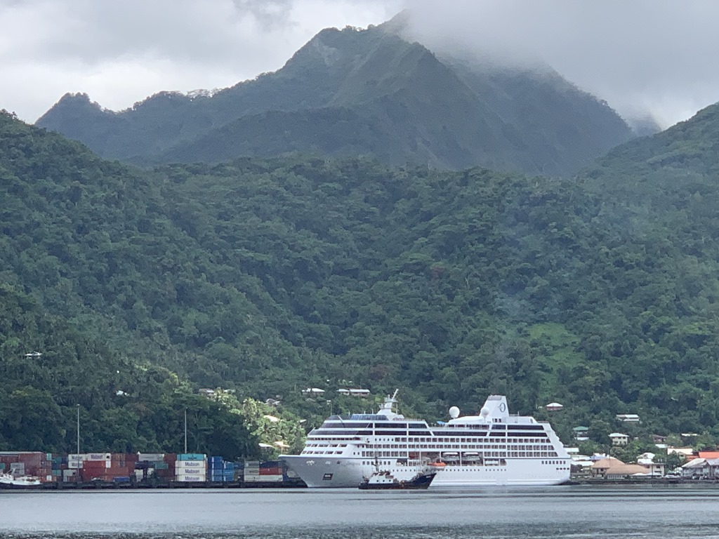 Pago Pago is pronounced Pango Pango and it is absolutely lush and beautiful.  The town is at the western end of an L- shaped bay and surrounded by beautiful mountains.  Here are a couple of pictures taken as we sailed in.