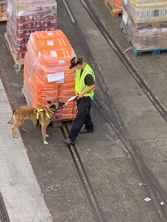 When we left Auckland, we watched a security officer and a dog go to every pallet of goods to be brought aboard the ship. The officer cut a hole in each side of the plastic around the pallet and the dog sniffed each side.  The officer then put a paper on each side to identify that it had been inspected.  Interesting.