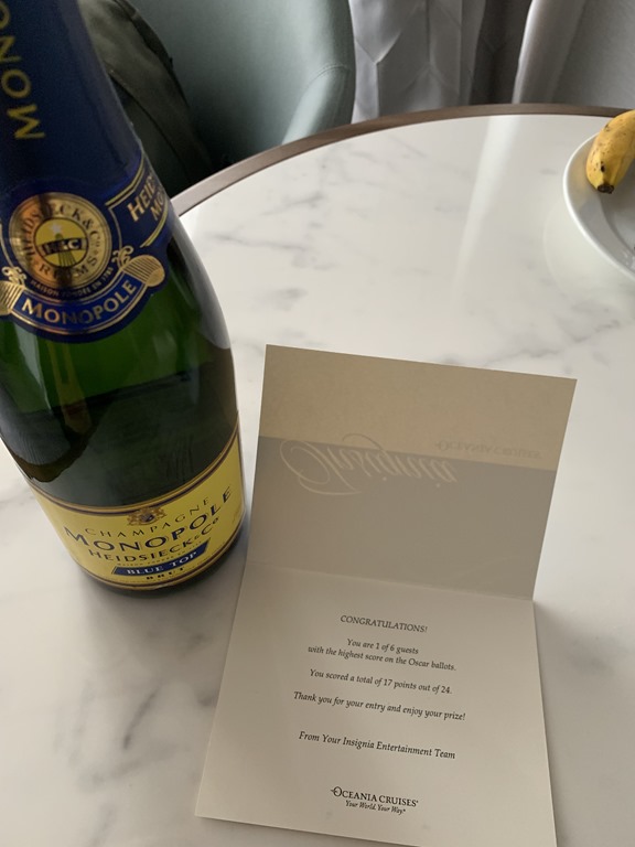 I also got a surprise in the cabin.  I was one of 6 people who had the most correct answers to the Oscar winners.  We all had 17/24 correct.  We all received a bottle of champagne!