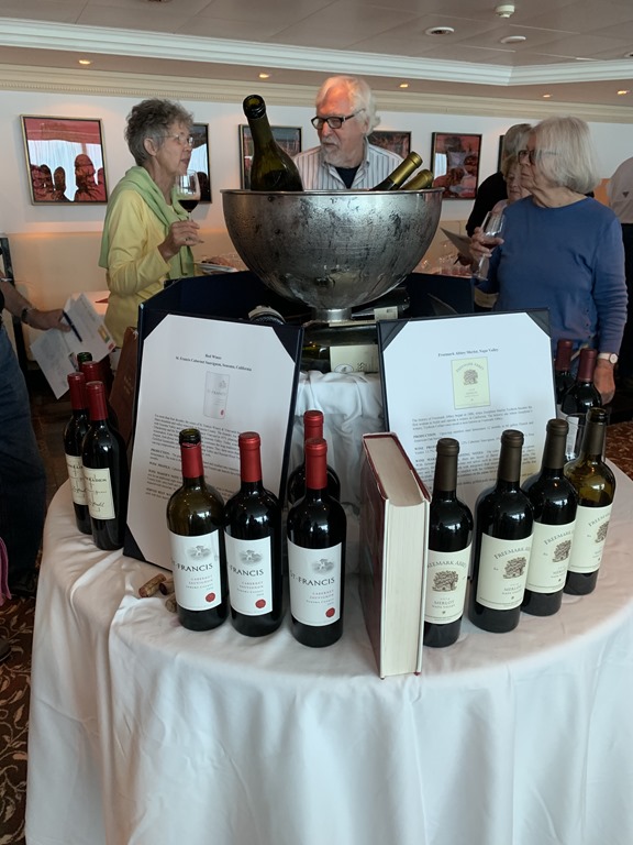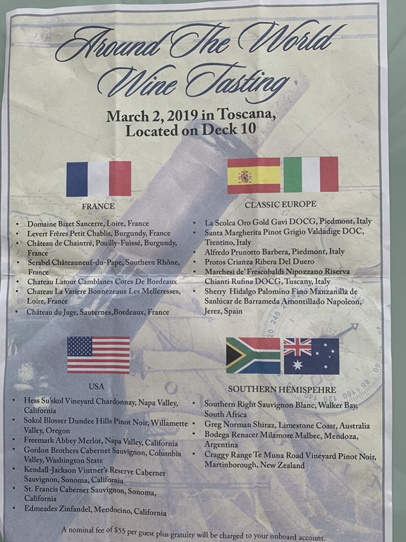 In the afternoon, Norm and I both went to an Around the World wine tasting. There were many different wines to taste! They were from Classic Europe, Southern Hemisphere, USA and France. The head sommelier, Lubo, who is so knowledgeable, was hosting, with his whole team. I tasted about 6 of them and made some notes but I know that Norm had a much more robust tasting! This was held in the Toscana restaurant and about 60 people were there.
