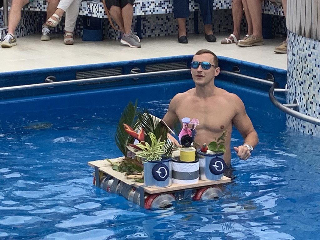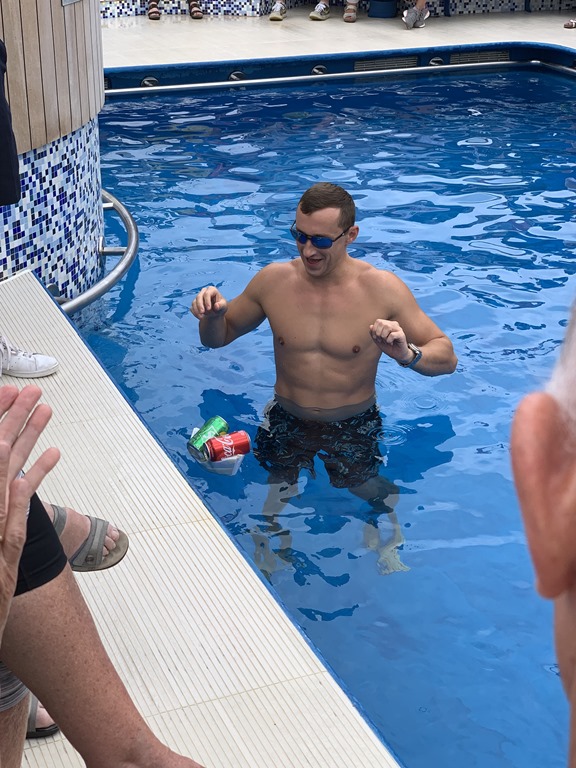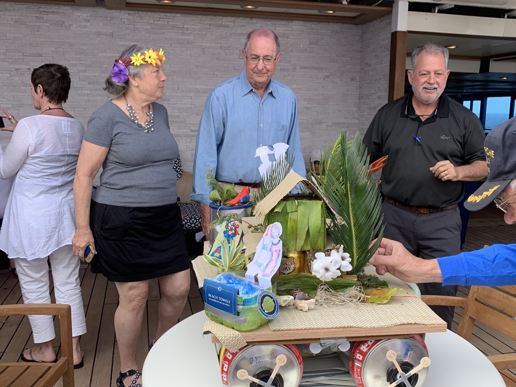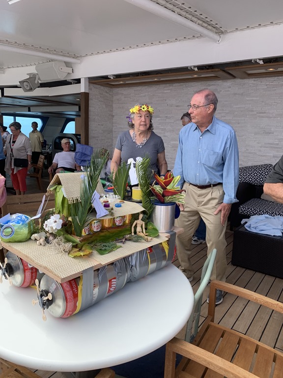 Our captain and staff captain were the judges and the team with our friends, Mike and Maralyn (in the individual pictures), won the top prize of big O points – each team got champagne as well. Theirs was really a work of art, and all 3 were seaworthy.
