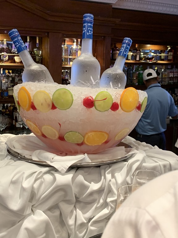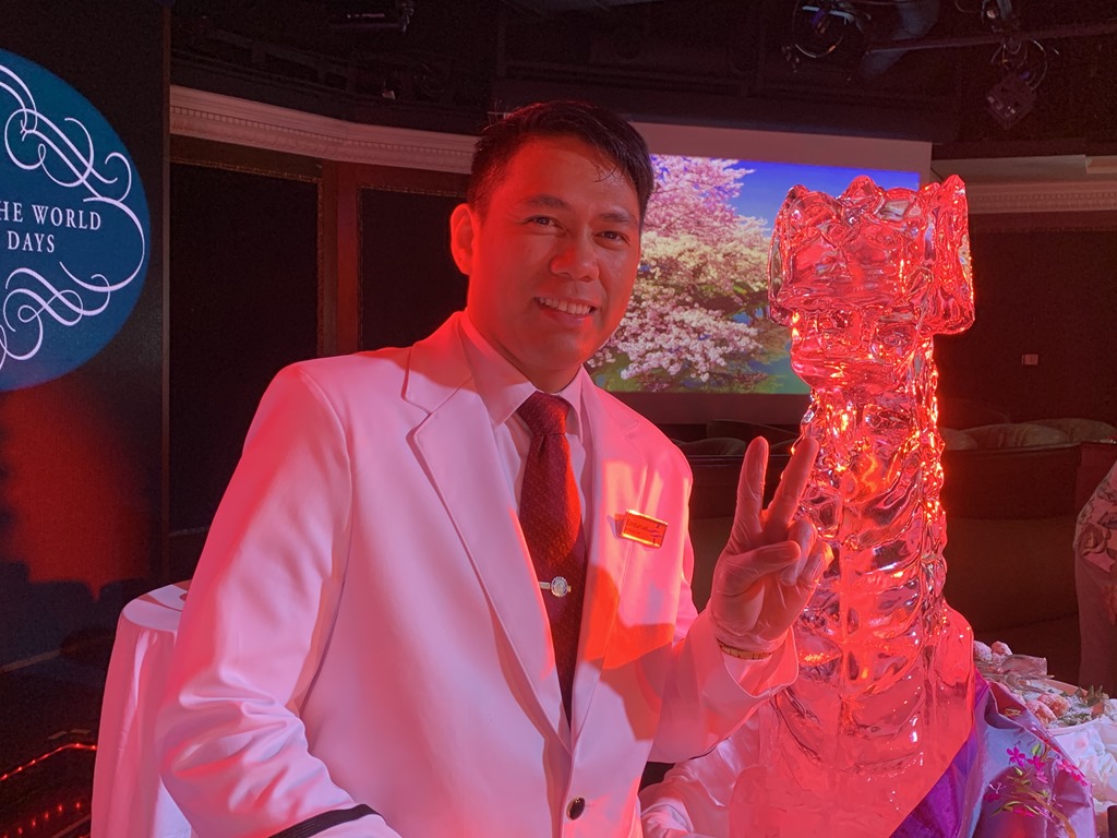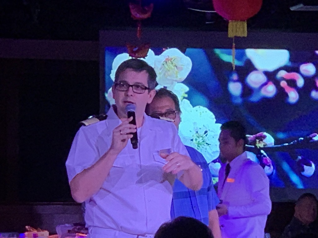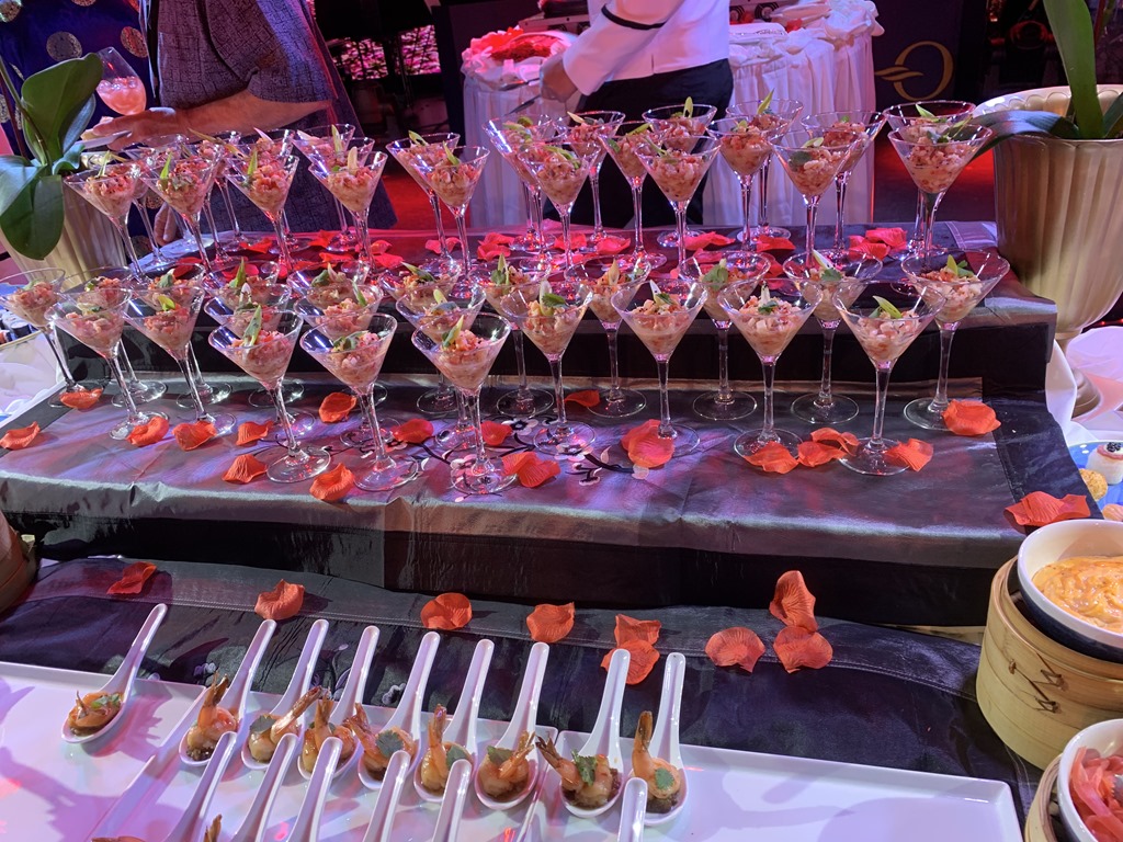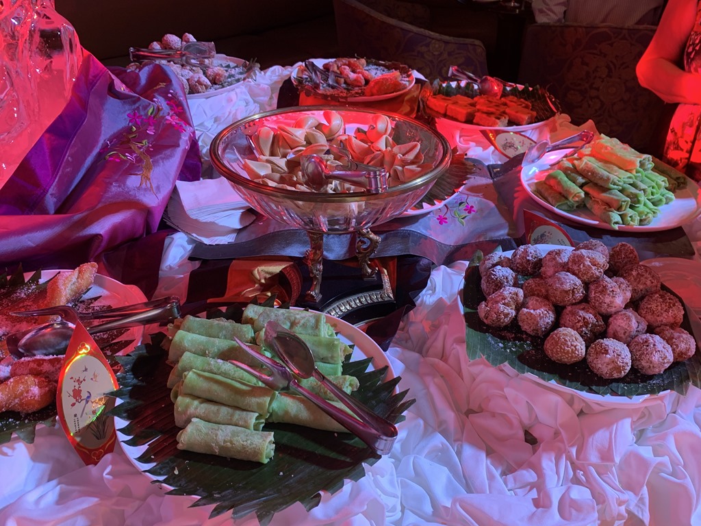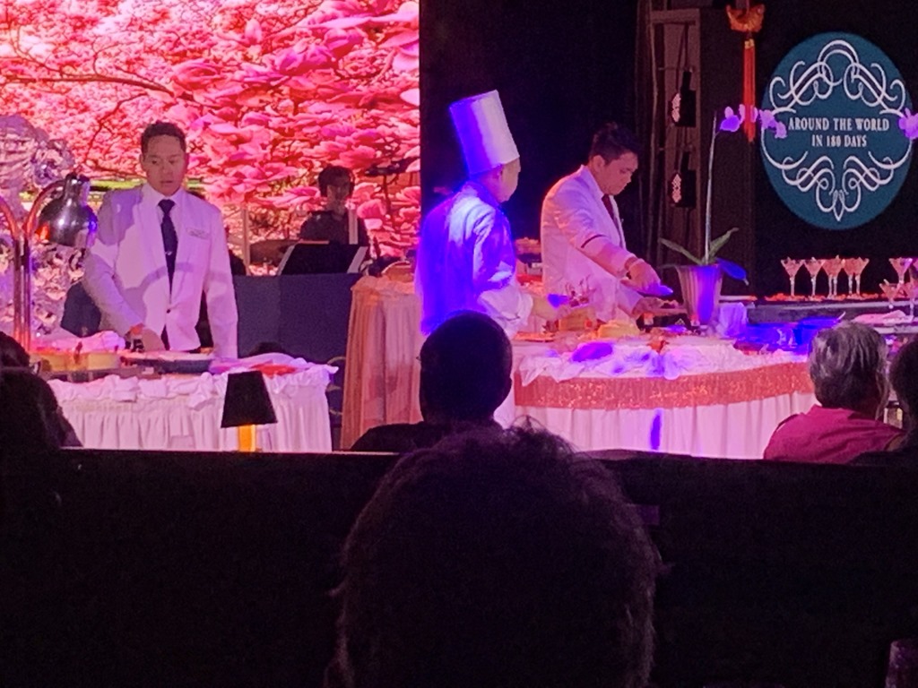 Yesterday, we were invited to a party at 11:15 AM for the ATW guests in the Insignia lounge. It was an Asian theme and wow, did they do it up right. Many types of Asian delicacies, including sushi, tuna, ceviche, egg rolls, chicken wings, rice balls, dumplings and many more. Then there was a whole array of sweet items too. Amazing. We started off with a Bejing bellini, which was champagne and lichee juice and it was delicious. There was a video of some of the highlights of the trip so far. Damien, the general manager, welcomed us and the new entertainment team did some Broadway songs from the show that they will perform tonight. Lovely event and no need for lunch to be sure!