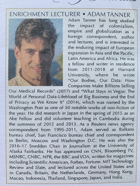 Today we reached the last port in Australia, Darwin. We have a pilot on board as it is tricky to navigate the Great Barrier Reef, and he has made several announcements as we passed Wednesday Island and other islands on our route to Darwin. He also gave a lecture which was standing room only, as have the lectures by our newly arrived guest enrichment lecturer, Adam Tanner.