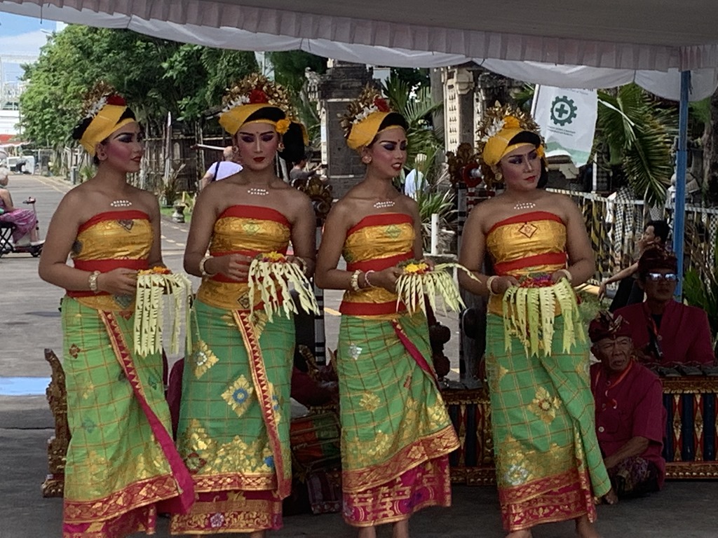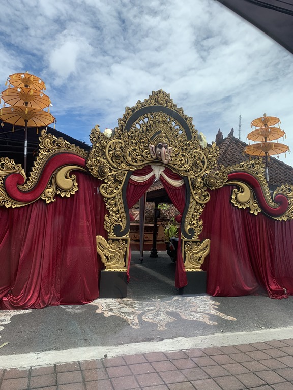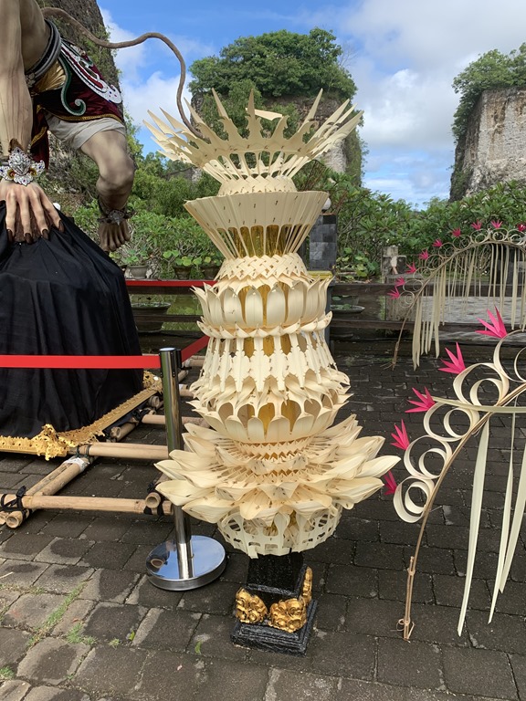 We saw bamboo poles decorated with young coconut leaf decorations lining the streets all over Bali. These intricately decorated poles, naturally curved at the top, comprise harvest items such as rice, fruits, coconuts and coconut leaves. The men of the households erect their ‘artwork’ at each household gate on the eve, resulting in an impressive view throughout all village roads.