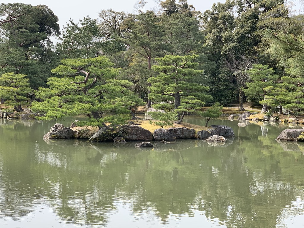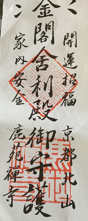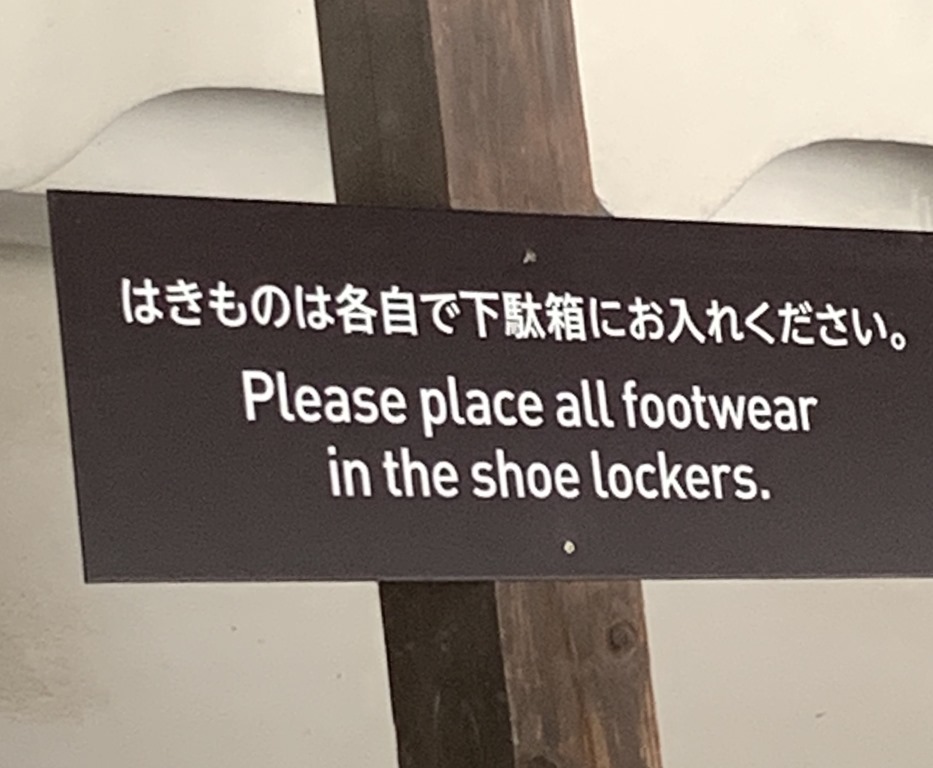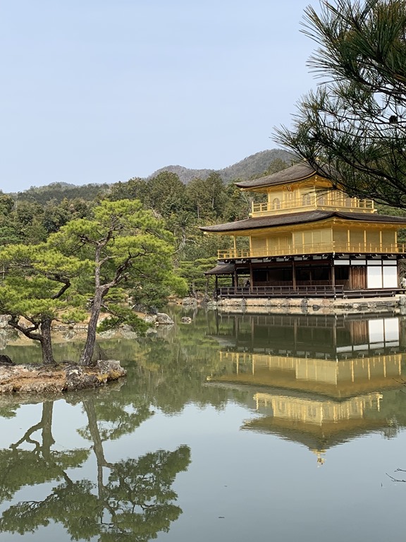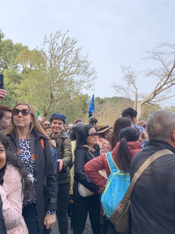 Our first visit was to the Golden Pavilion – Rokuon-Ji Temple. This was built by Shogun Ashikaga Yoshimutsu in 1397. It was a three story home and was converted to a temple by his son. It is, as many temples are, positioned at the edge of a tranquil pond. The walls and eaves of the second and third stories are covered in shimmering gold leaf. No one is allowed into the Golden Pavilion but just seeing it, the peaceful gardens and the reflections in the pond are simply spectacular. It was VERY crowded there and so some of our pictures have other people in them and I took one of the crowds. I can only imagine what it must be like when there are fewer people there. Does this sign remind you of Trader Joe’s?