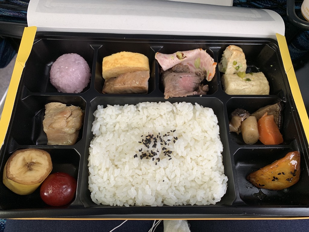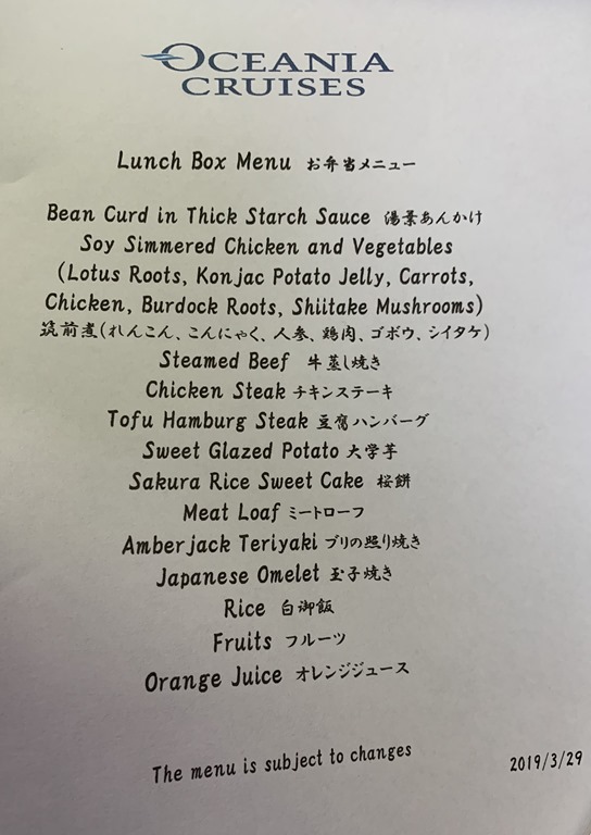 After our tour of the castle, we went back to the port and were given a bento box lunch to eat on the bus trip back. Mari was pleased when we took the chopsticks instead of the fork.