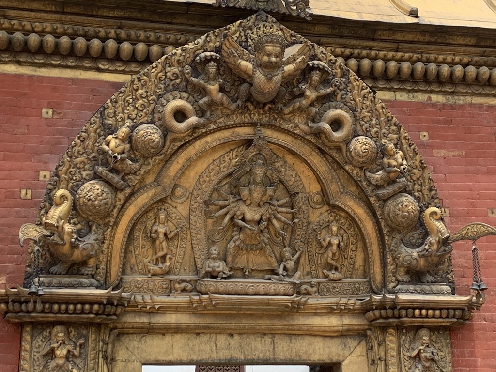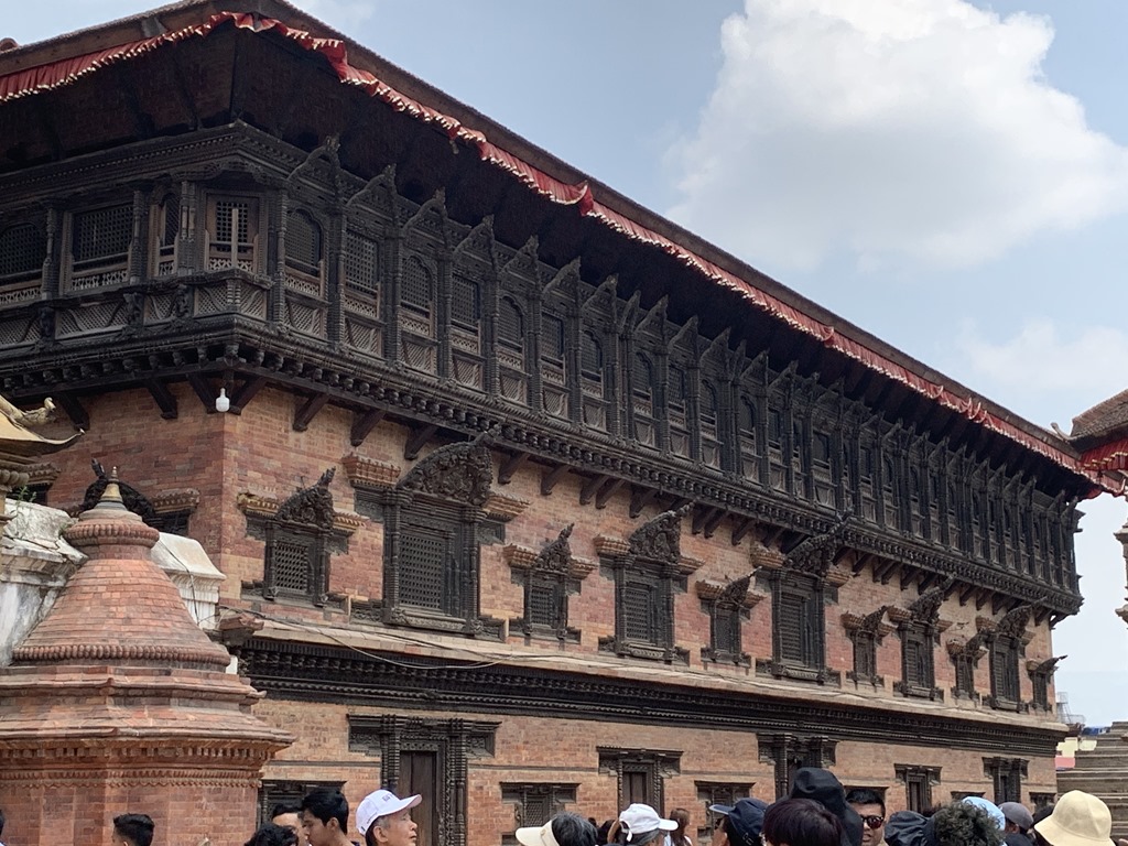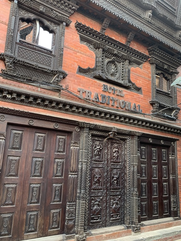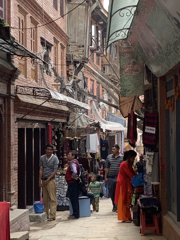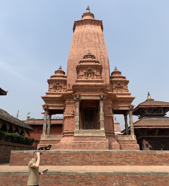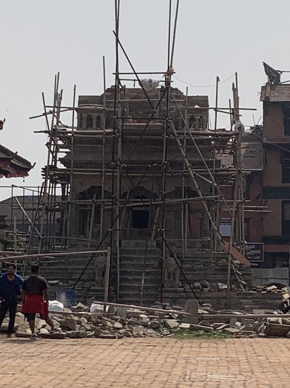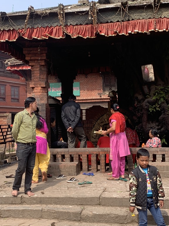 At Taumadhi Square, the second most important, there are many stone spouts, and fabulous wood and stone carvings like the ones we saw in Kathmandu yesterday. These are made of solid pieces of stone or wood. This area was hit hard by the 1934 earthquake and the 2015 one.  Sagar says that it is predicted that earthquakes come every 80 years here.  Most of the destruction in 1934 wasn’t reconstructed since historical significance wasn’t well understood then. Now, tourist entrance fees are collected for preservation of the culture, cleaning the city, and making it one of the best tourist destinations in Nepal.