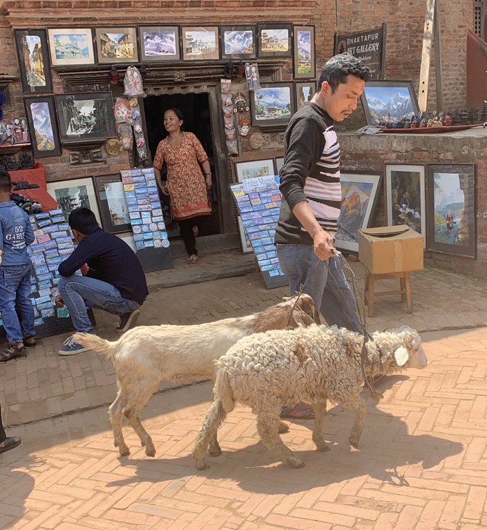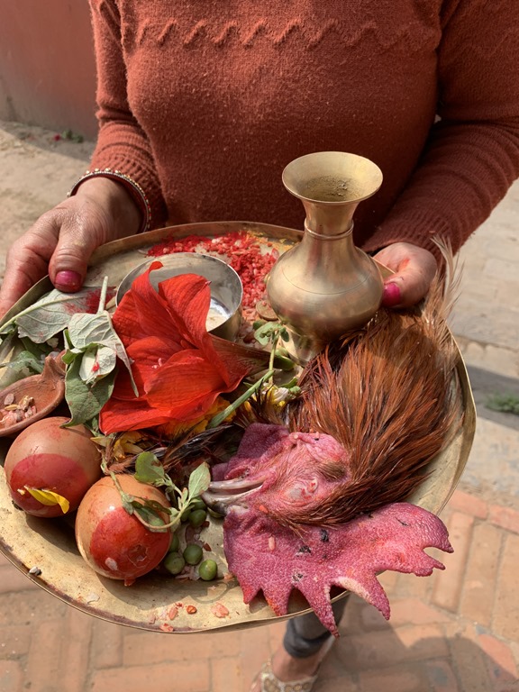 We passed through the city gates and the first thing we saw was a goat.  Sagar told us that due to the festival that was taking place, this goat was about to be sacrificed.  Many activists want animal sacrifice to be banned but that hasn’t happened so far.  108 is considered a sacred number in Hinduism and Buddhism, so for festivals, 54 goats and 54 bulls might be sacrificed.  Others sacrifice chickens or ducks. For those who don’t believe in animal sacrifice, they use the coconut water and sometimes eggs for the sacrifice. This woman has that type of sacrifice prepared.
