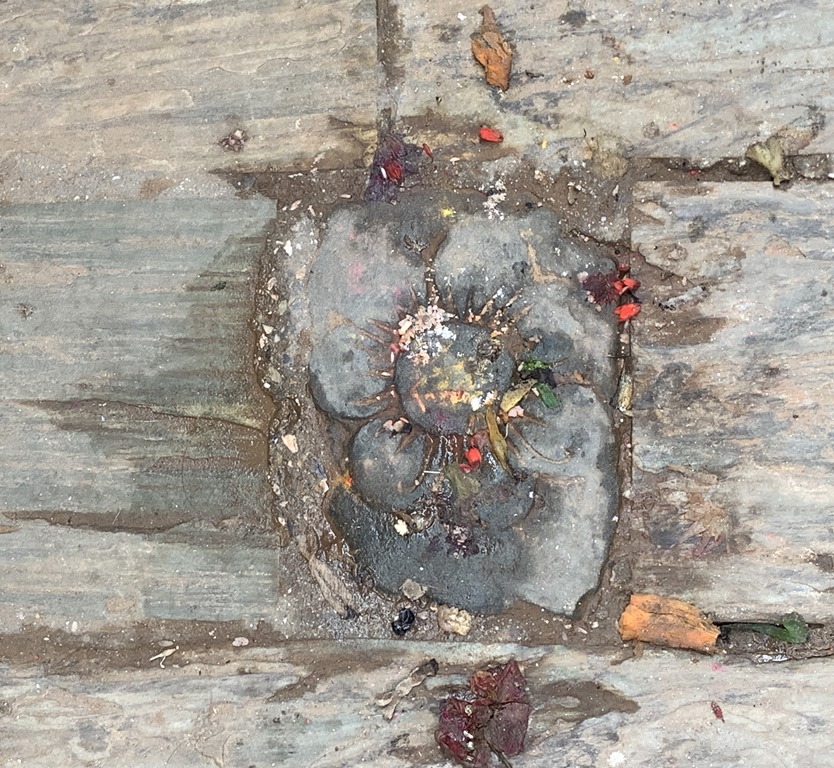 IMG_6360This is the offering you see in front of homes and shops.  First, cow dung is spread, then flowers, fruits, etc., are placed on the lotus stones.
