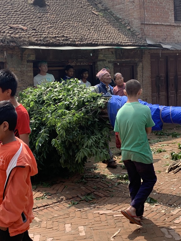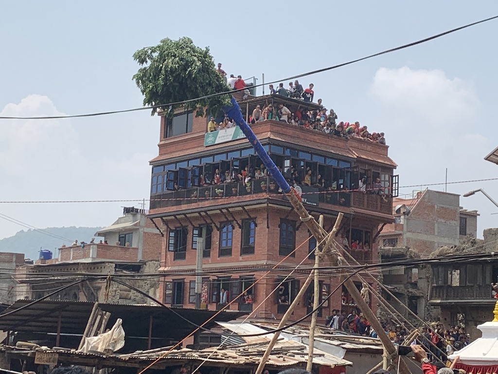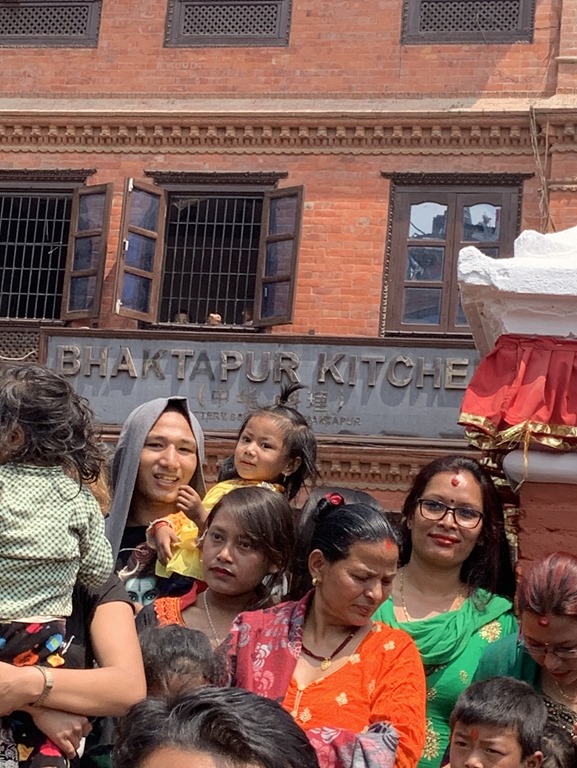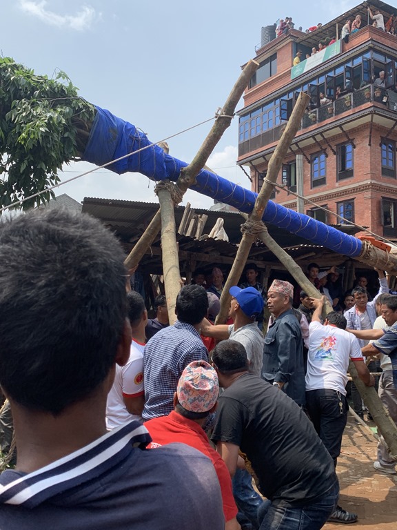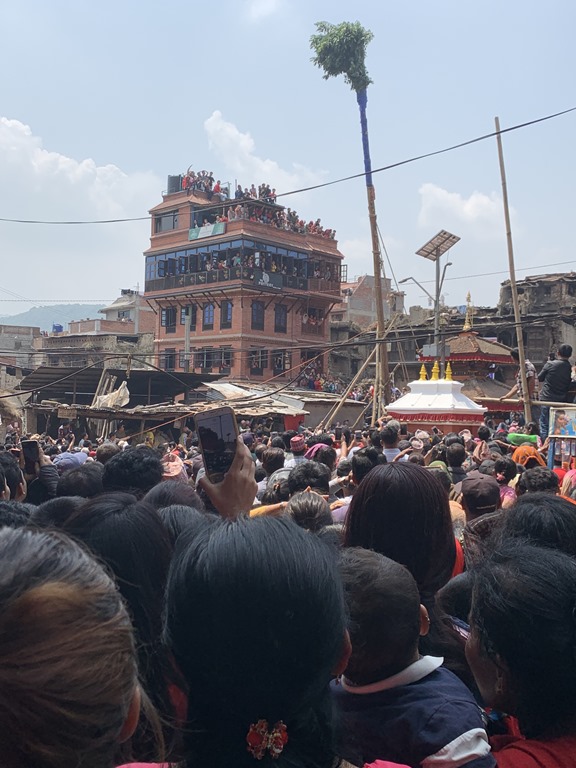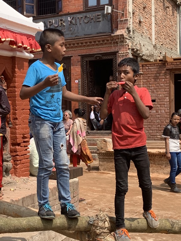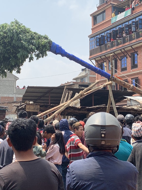 Today was the festival of Biska Jatra (New Year) and they raise a long pole with tree leaves attached – 90 degrees. This is done with ropes and logs – so amazing to see how they do it. It remains up for three days to a week and when it falls, it symbolizes the destruction of evil. We stayed in this area for almost 2 hours to watch this event.  The place was packed with families, and there was a constant drum and cymbal serenade during the raising of the pole. It was like NY Eve in Times Square with the crowds!