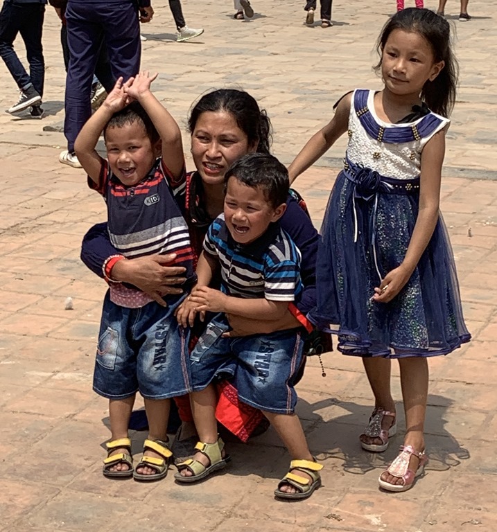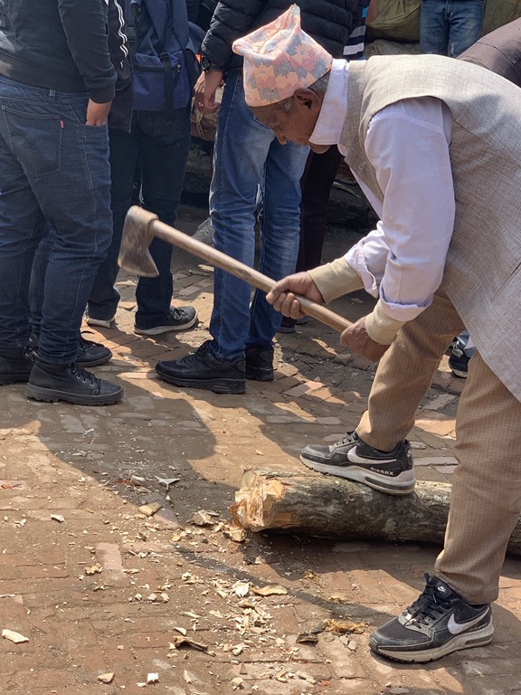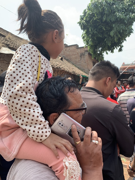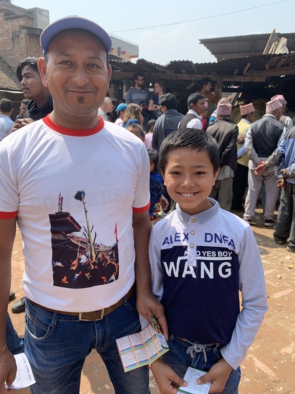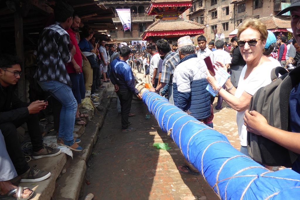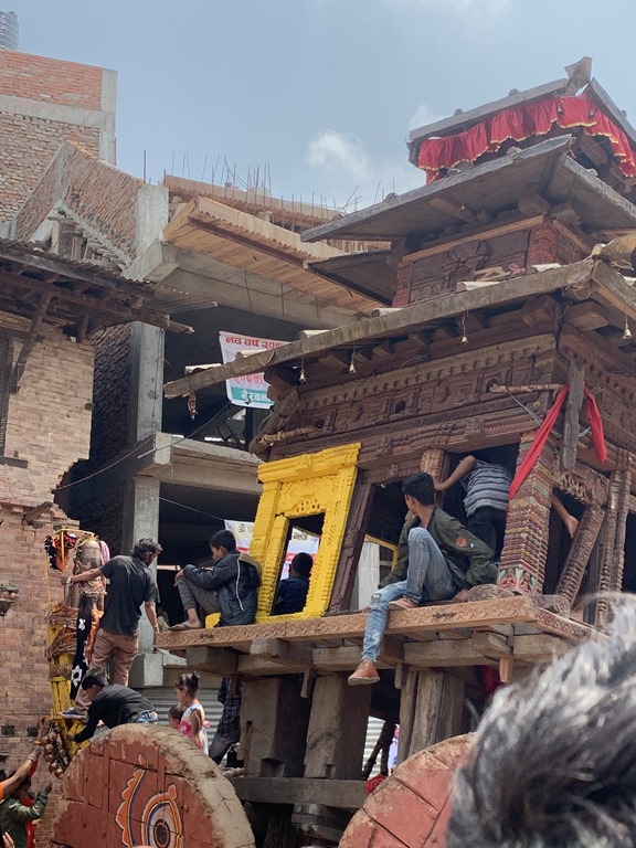 Today was the festival of Biska Jatra (New Year) and they raise a long pole with tree leaves attached – 90 degrees. This is done with ropes and logs – so amazing to see how they do it. It remains up for three days to a week and when it falls, it symbolizes the destruction of evil. We stayed in this area for almost 2 hours to watch this event.  The place was packed with families, and there was a constant drum and cymbal serenade during the raising of the pole. It was like NY Eve in Times Square with the crowds!