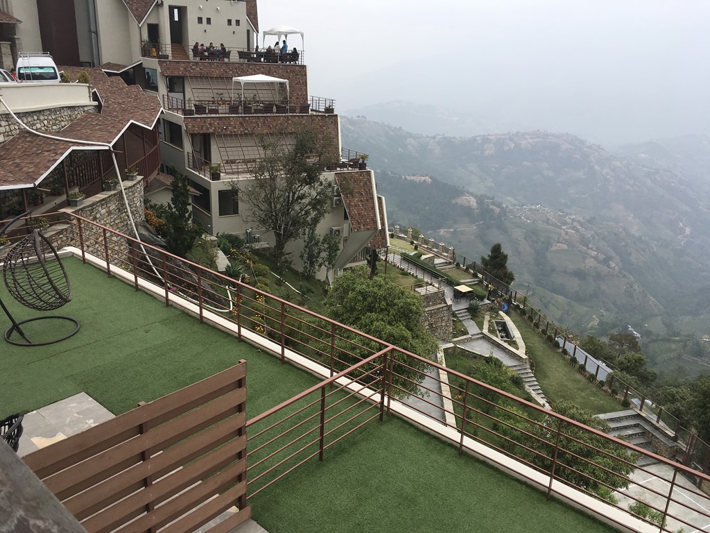 When we got to our room, wow, how we wish it was clearer because supposedly the sunrise and sunsets here are quite spectacular. You can see how hazy it is, so no spotting of the Himalaya vista right now. And how this hotel is built right into the hills.