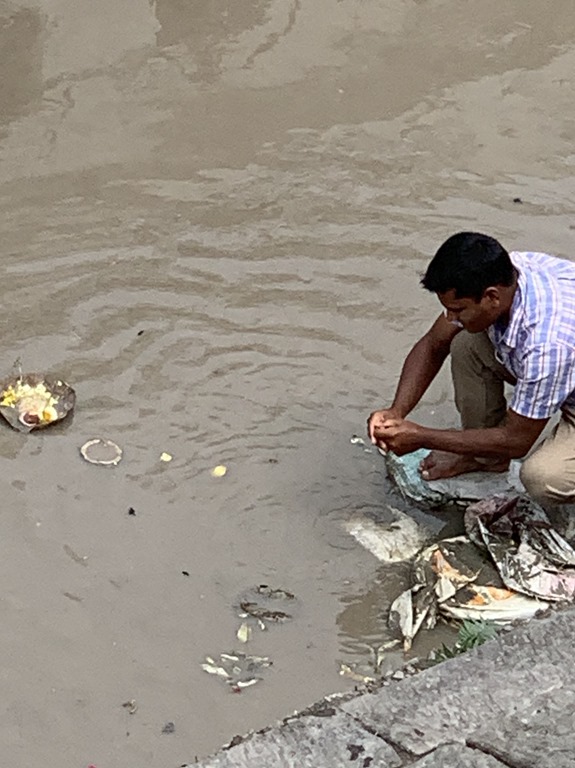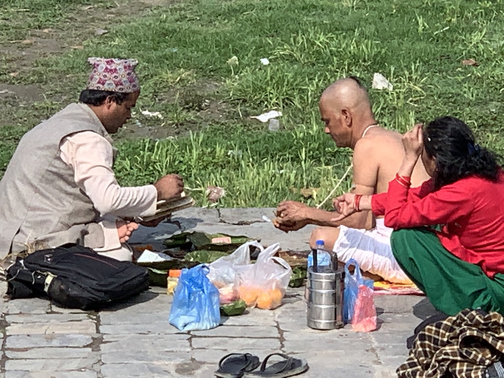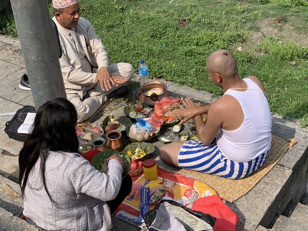 Many families then meet with Brahmins and prepare offerings, Men shave their heads. Here are some of those families.