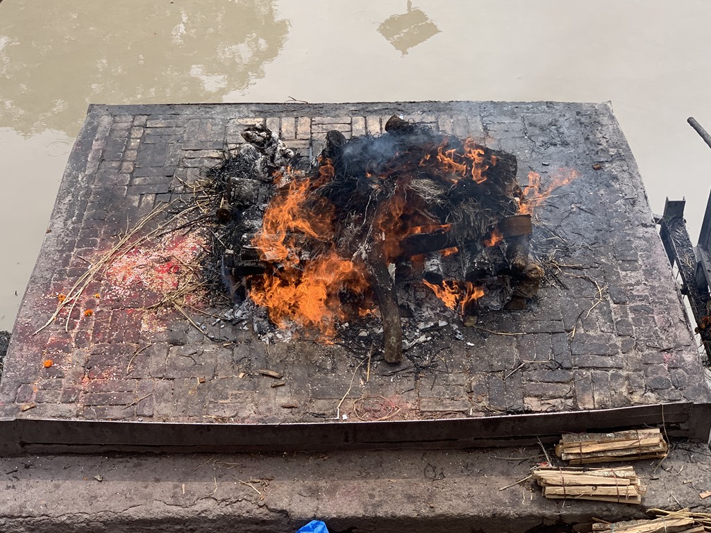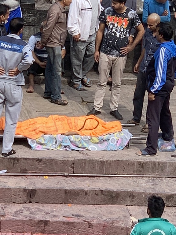 Sagar explained the process to us. Cremation is done 24 hours after the death. The body is wrapped and brought by bamboo stretcher to the site. Most Hindu people choose to die at home. If the person dies in the hospital, a metal stretcher is used, and if they die outside of the jurisdiction a casket is used but the body is removed from the casket at the site.