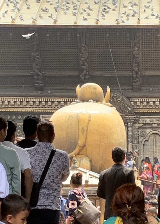 Our first visit today was to the Pashupatinath Temple. Dedicated to Lord Shiva, Pashupatinath is one of the four most important religious sites in Asia for devotees of Shiva and it is the most important in Nepal. It is the largest temple complex in Nepal and it stretches on both sides of the Bagmati River which is considered holy by Hindus. Monday is the day that is dedicated to the Hindu God Shiva and so there were lines of people to get into the temple for worship. They believe that if you worship on the deity’s special day, all your dreams will be fulfilled. As in most Hindu temples, only Hindus are allowed in, but the outsides of the temples are so interesting in and of themselves.