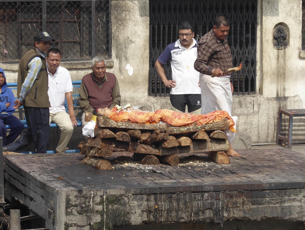 The oldest son is the one that lights the flame, after the feet are washed and a ritual water or milk is put on the lips. This represents the last act. If there are no sons, a worker at the site performs this ritual. Women are not allowed to light the funeral pyre.