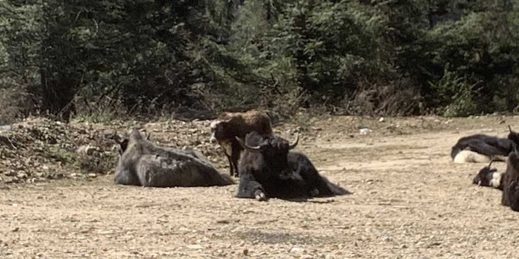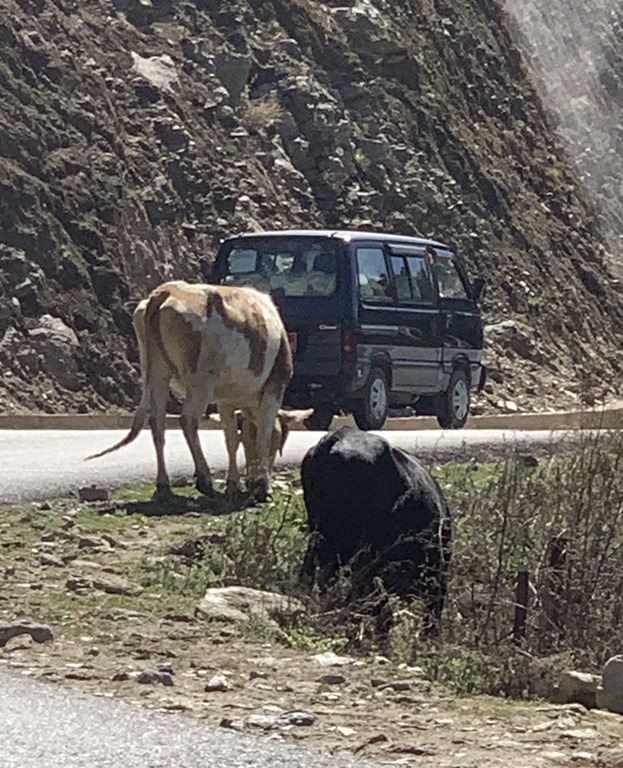 and began the 3 hour, 71 kilometer drive to Punakha.  This was the first capital of Bhutan before it was moved to Thimphu.  The road we were taking is the only road to Punakha and was the first road in the country and only built in 1961.  It is a very winding road over the mountain. We saw cows in the road, yaks on the side of the road, and I wish I had been quicker with the camera because about 5 small horses ran right next to my car window.  Maybe I will catch them on the way back tomorrow.