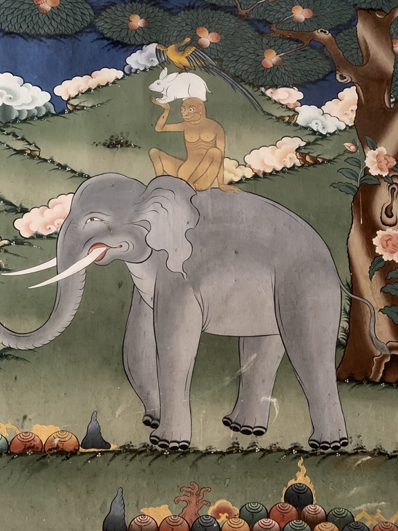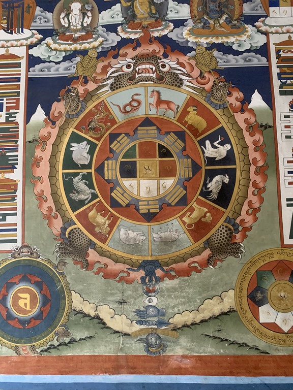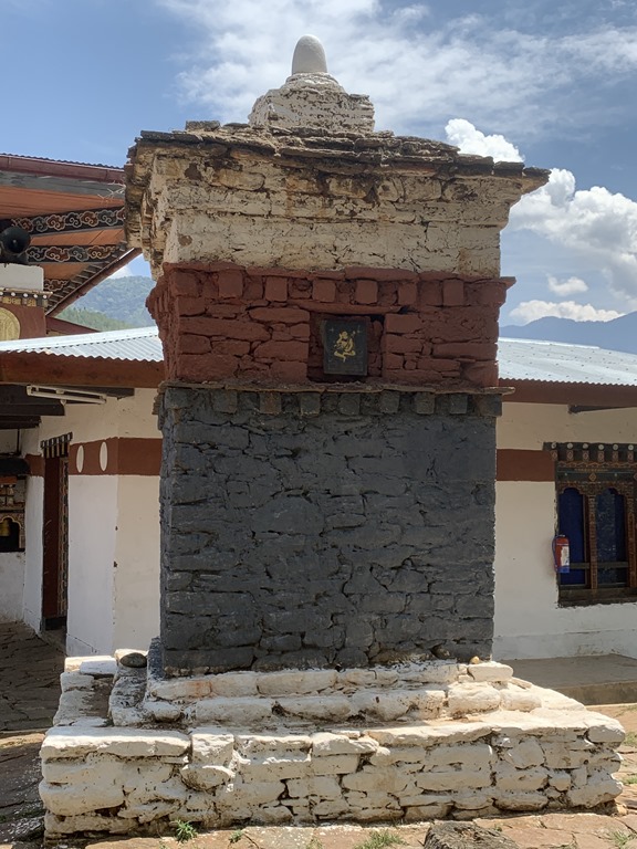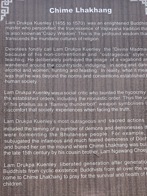 This symbol is called the “Magical Thunderbolt” based on Lama Drukpa Kuenley.  He is called the Divine Madman because when he first came to spread Buddhism, he went around the town naked and did a lot of things that made people wonder if he was really a holy man.  The legend says that he subdued a demon with his phallus – the Magical Thunderbolt – chained the demon and turned him into a black dog.  So there is the only black stupa on the grounds of this temple. We are sitting under the Bodhi tree.