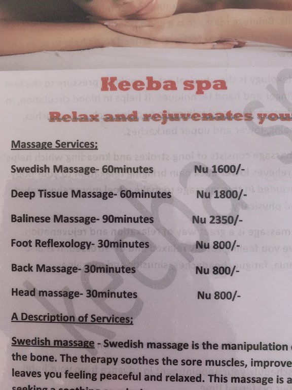 The most expensive is a 90 minute massage for 2350, which is about $34 US. Wow, on the ship that would be 10 times as much.