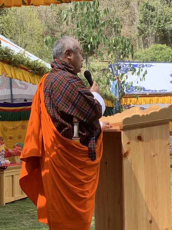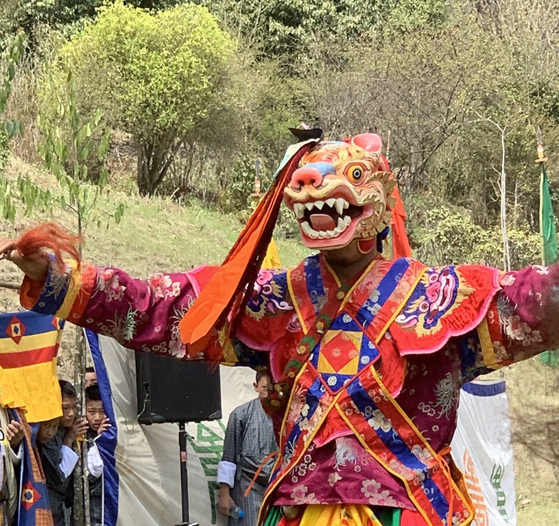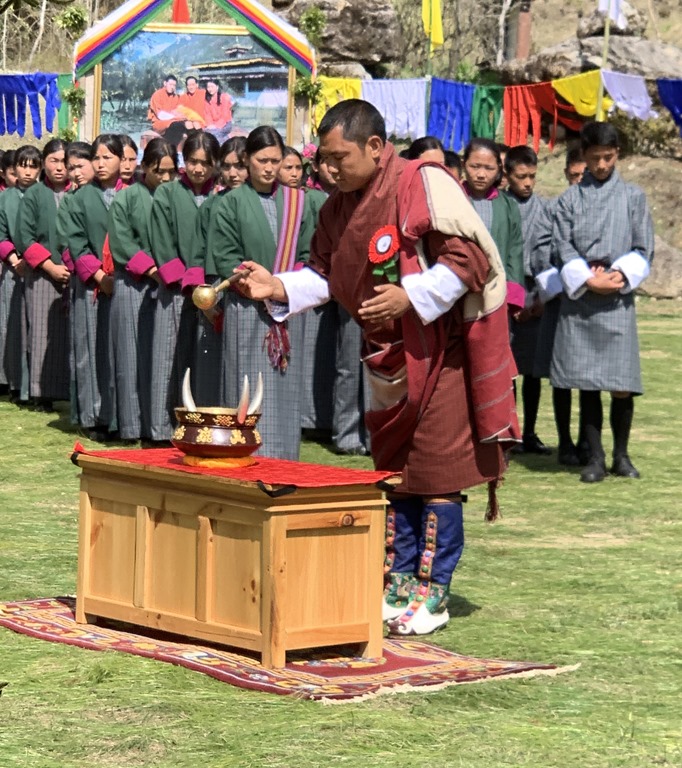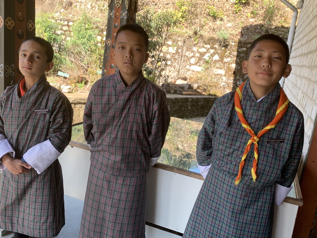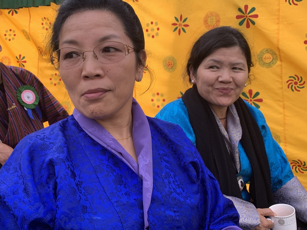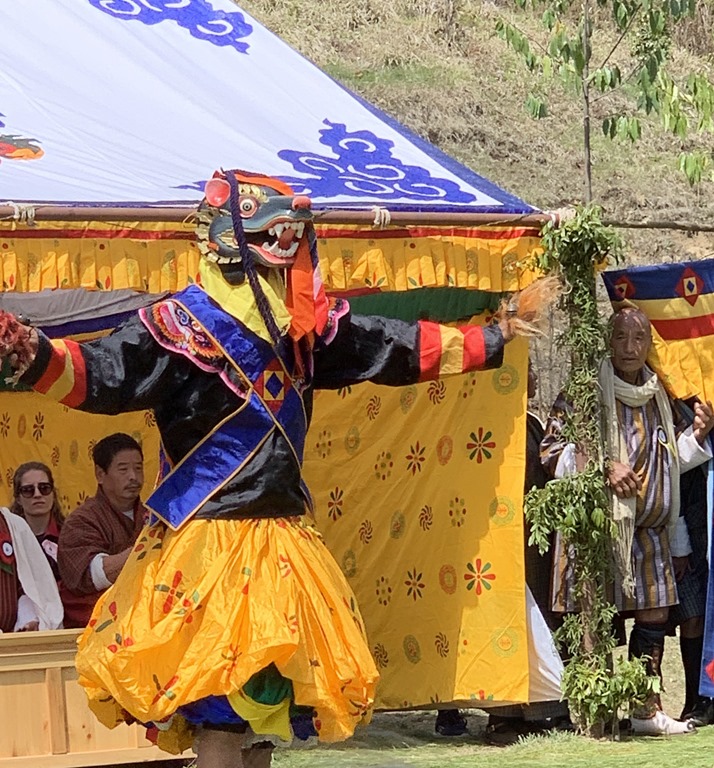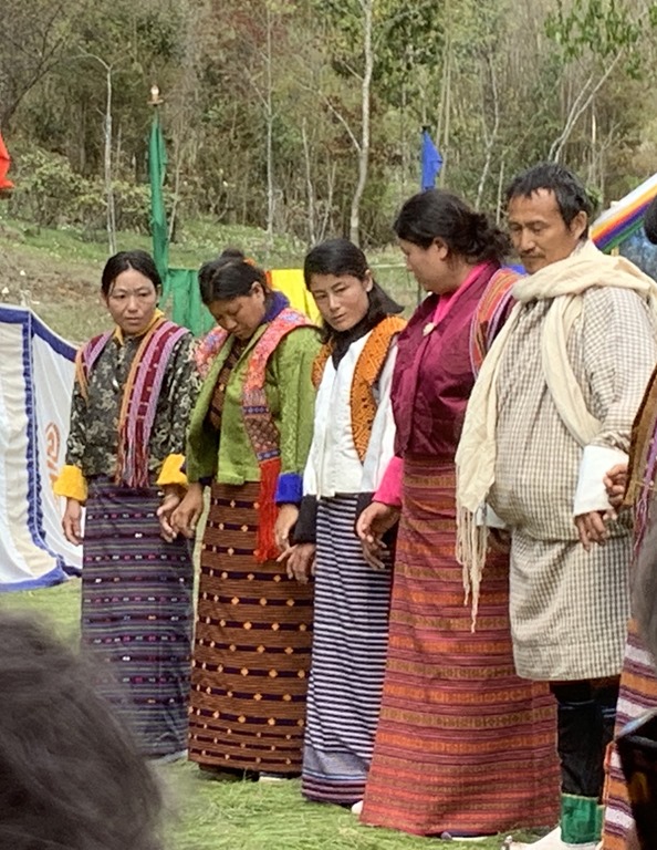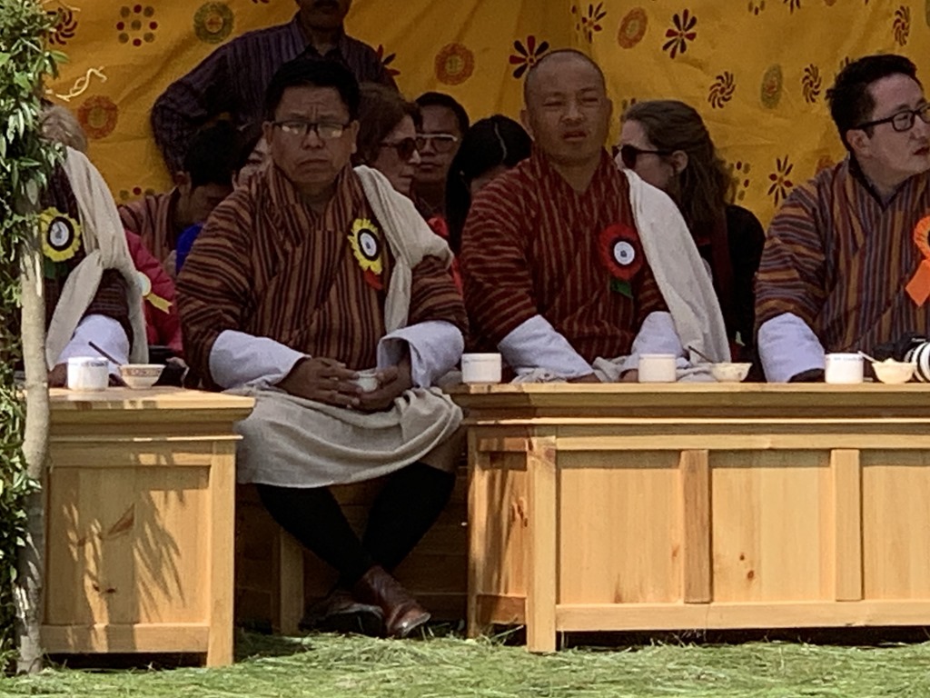 The Agriculture Minister of Bhutan was the distinguished visitor and he gave his speech in their language and also in English. Everyone here is very proficient in English. There were ritual dances and performances and we were fascinated by the whole thing. By happy co-coincidence, I sat next to two women from the local village. The one sitting next to me was educated in France and speaks many languages. She worked at the World Bank for 3 years. The other woman was her sister. They were so informative about the customs, the country and we had so much in common in our beliefs. It was a wonderful part of the day. And it turned out that the woman sitting next to me was the aunt of the leader of the village and a classmate of the Director of Tourism! She had a great sense of humor. She said that with the men’s national dress, it is a good thing that they need to wear the shawls for rituals because it covers them up. She said “if they had something to show, it would be all right!” The second photo shows what she means. The white shawls are worn by the men in all fortresses, and for all festivals and rituals.