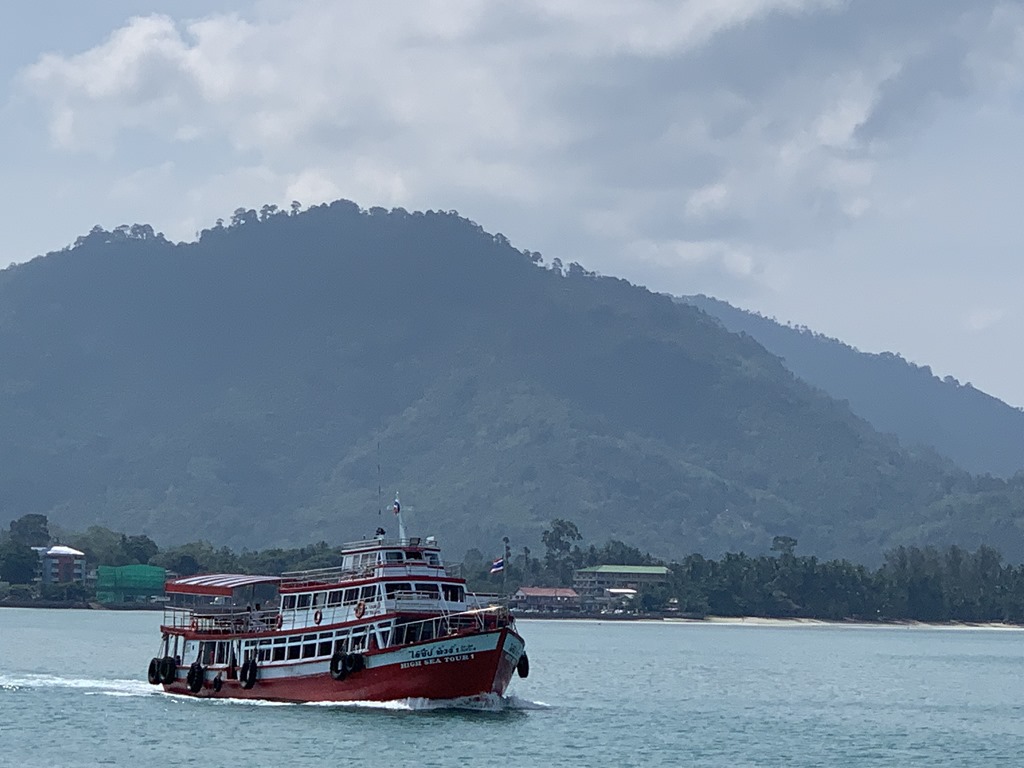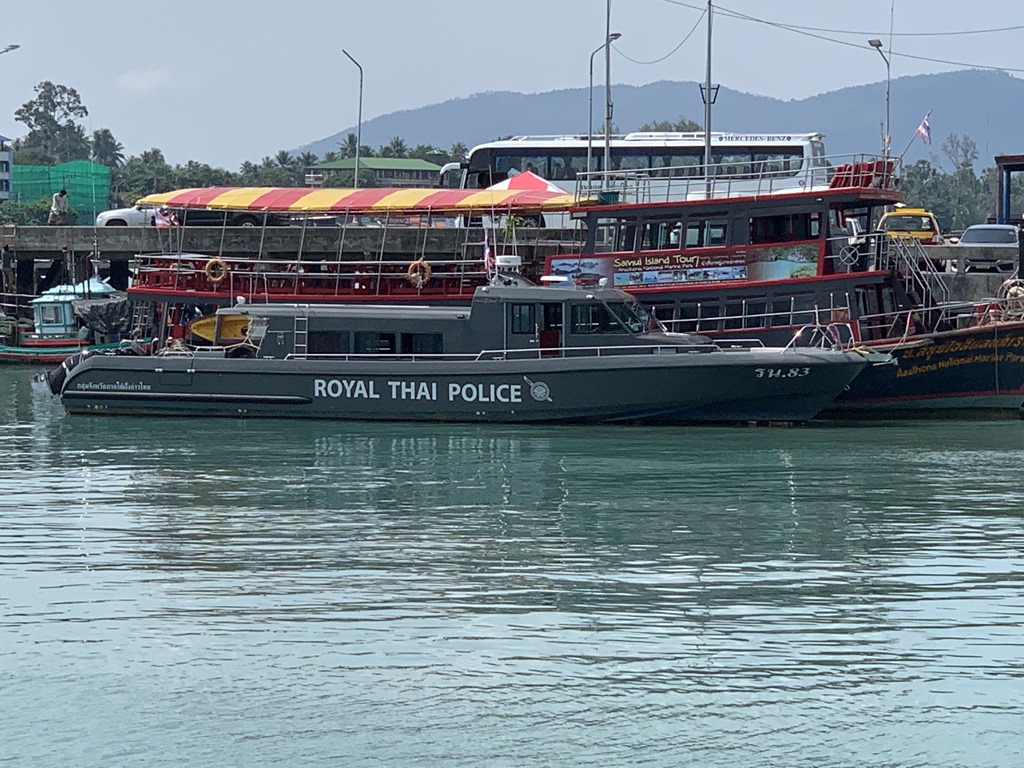 The smaller boat is the one that took us to shore, one of the others is a ferry the the last one belongs to the Royal Thai Police.