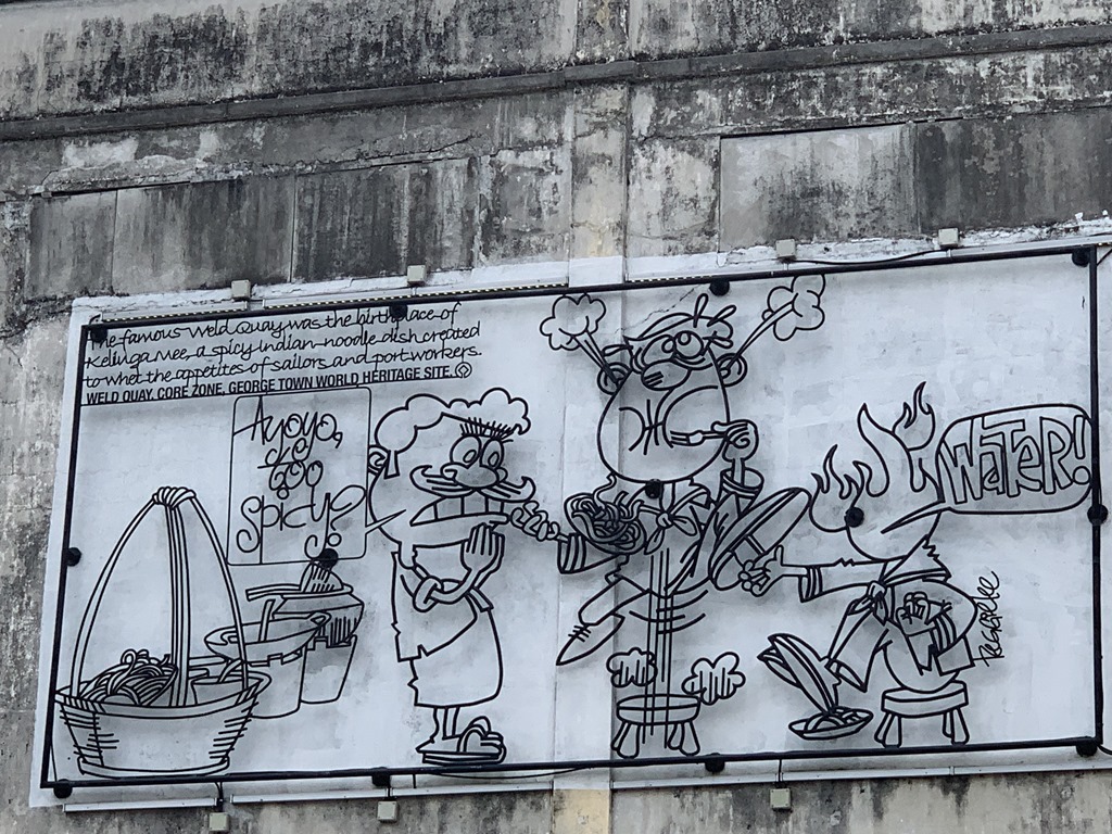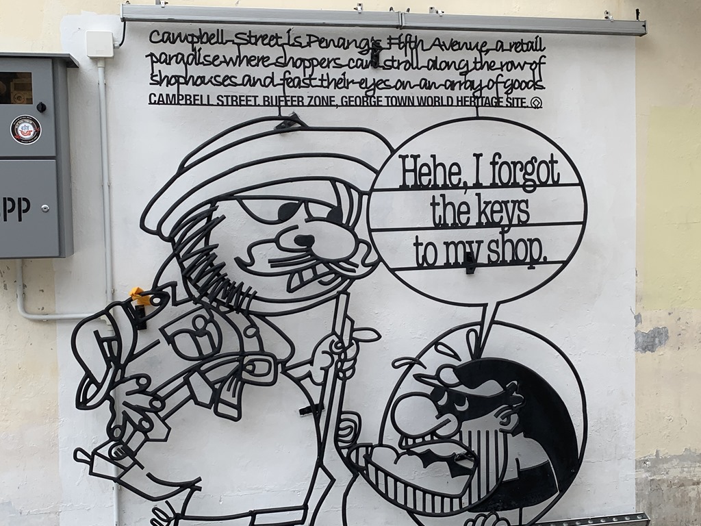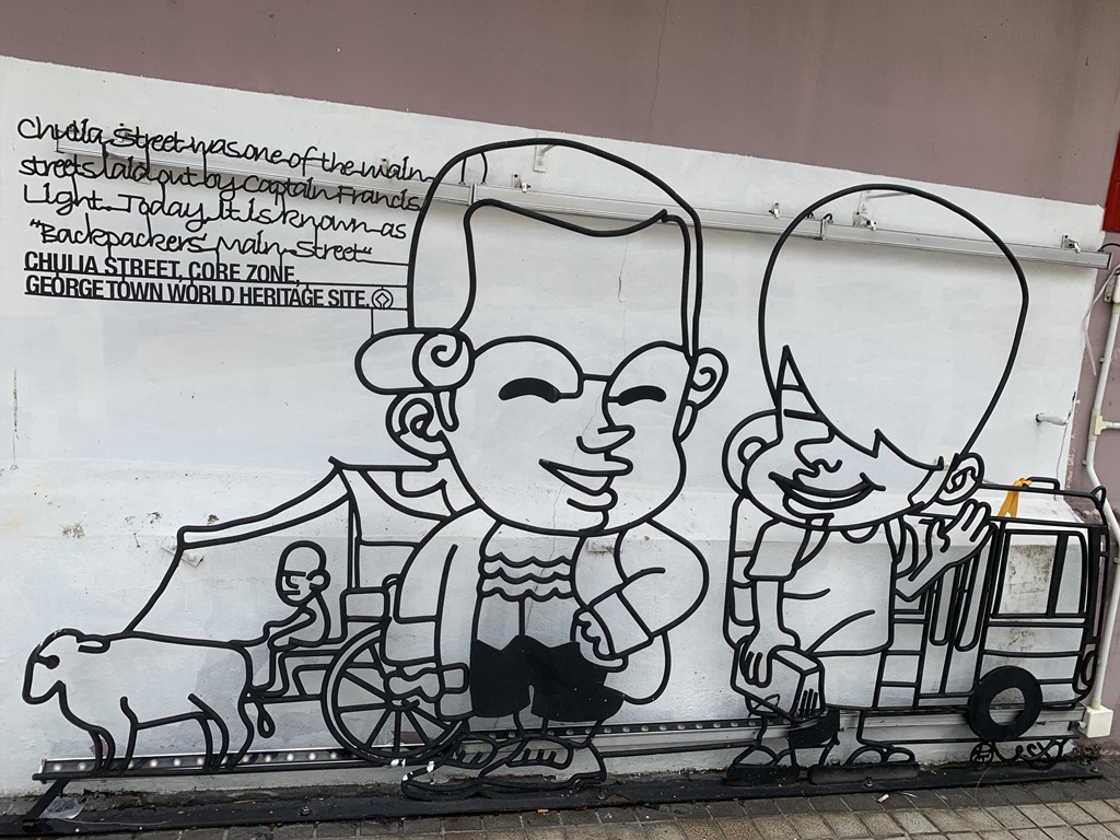 In an effort to brand the Georgetown UNESCO World Heritage Site, the state government opened a contest and the winning idea culminated in a unique series of steel rod caricatures which retells the history of the streets and stories of the communities in a local voice. The work started in 2010 and to date there are 52 steel rod sculptures. There are also wall murals. We thought the steel rod ones were so interesting. Here are a few of them.