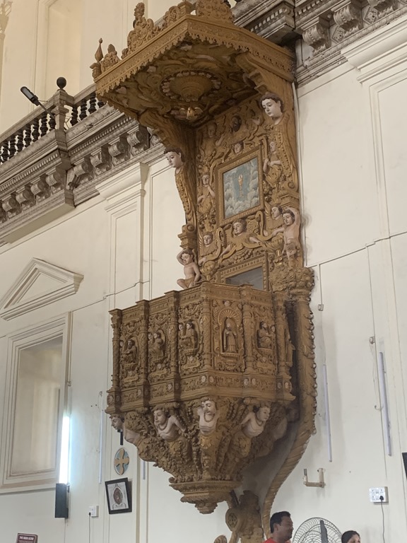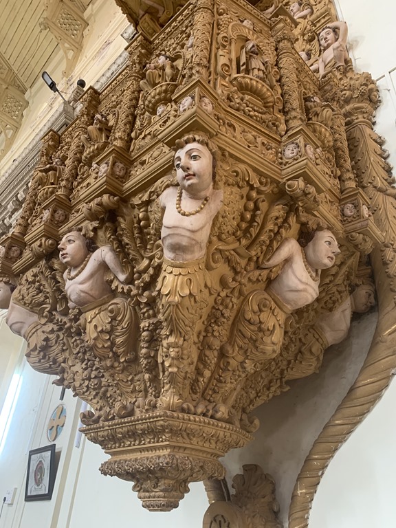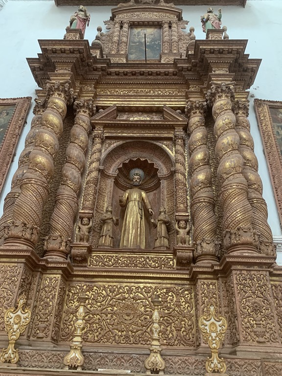 There are 14 churches in Goa but only 2 are active. This one is not active but all are still maintained well. It is beautiful outside and in. The carvings are all wood. And all of the windows are placed so that no artificial lighting was needed in the daytime.