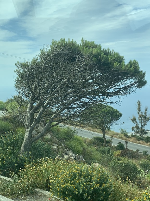 Another thing he pointed out and that we noticed is that all of the grapevines are small and close to the ground because of the fierce winds. The tree below shows how fierce it can be.