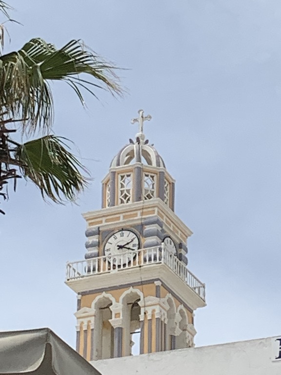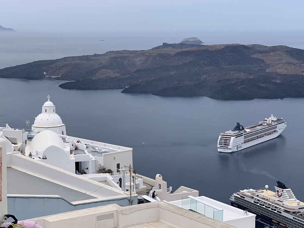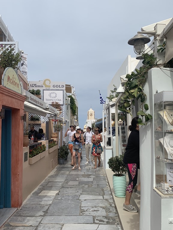 We went on to Fira, the island’s other village. Here we had as long as we wanted to spend. Great shops.. The last tender back to the ship was at 5:30 but the crowds for the cable car are long, so we walked all through the town and had a lunch overlooking the sea. Very wonderful and relaxing. Then we took the cable car down to the tender port and went back to the ship. Wonderful day!