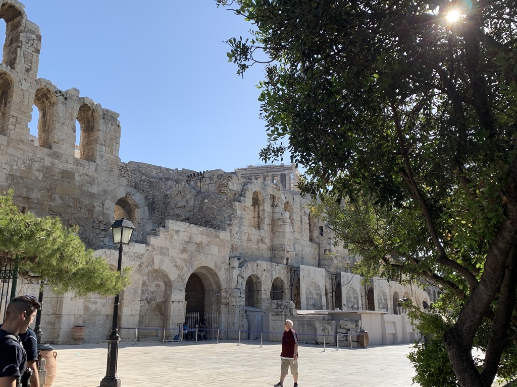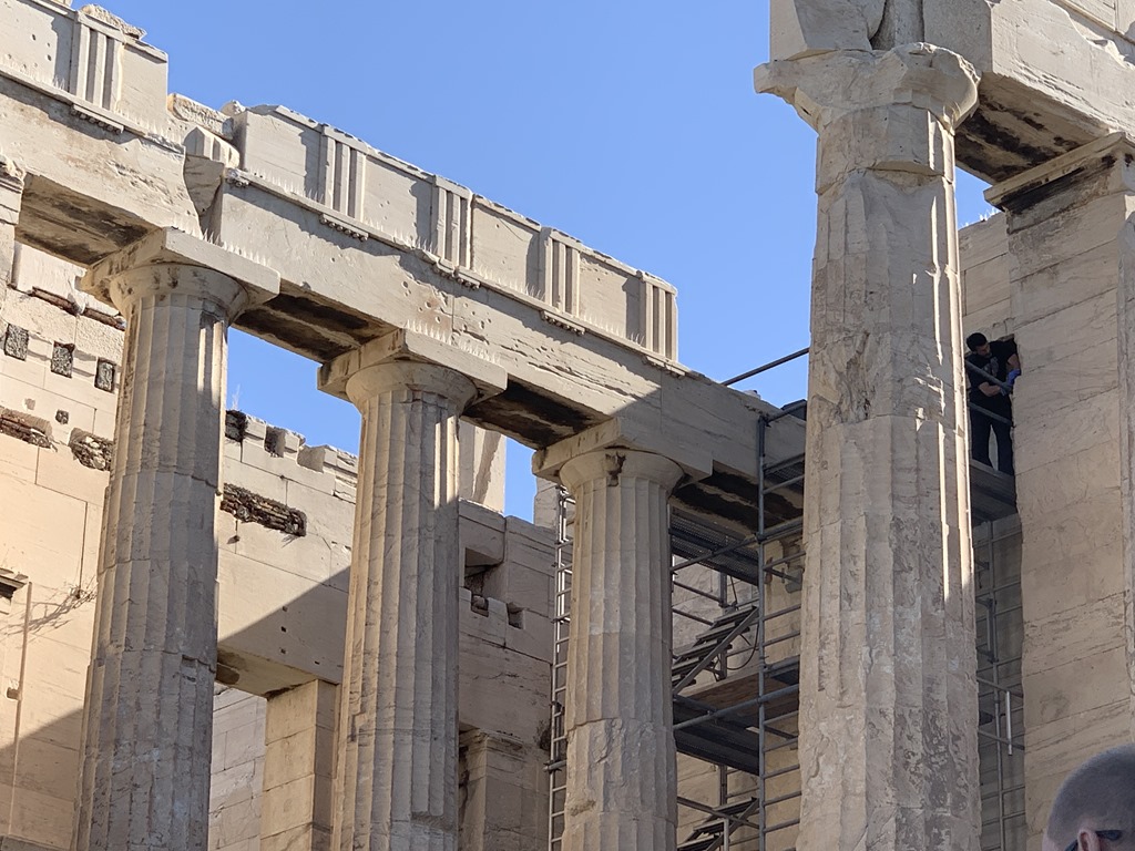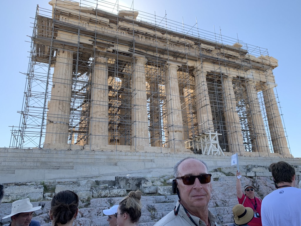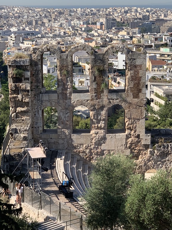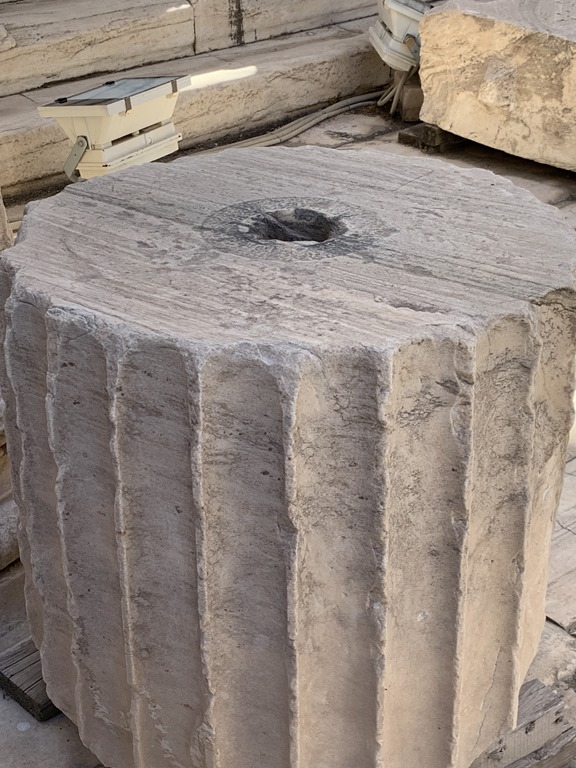 The Parthenon sits at the highest point of the Acropolis, 230 feet above the city. It was built to honor the goddess Athena and has been the model for thousands of buildings throughout the world. There are some columns on display with the center hole visible. Lead was used in these cavities to stabilize them. Elaina explained that the historians have evidence that the way the columns and blocks were brought to this high point in the city was to use trees as rollers with the blocks or pieces of the columns on top and then roll them up the hill. Painstaking work I would say, but the results are impressive all these centuries later. Restoration work is constantly in progress as you can see from the iron bars.