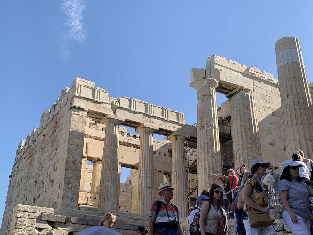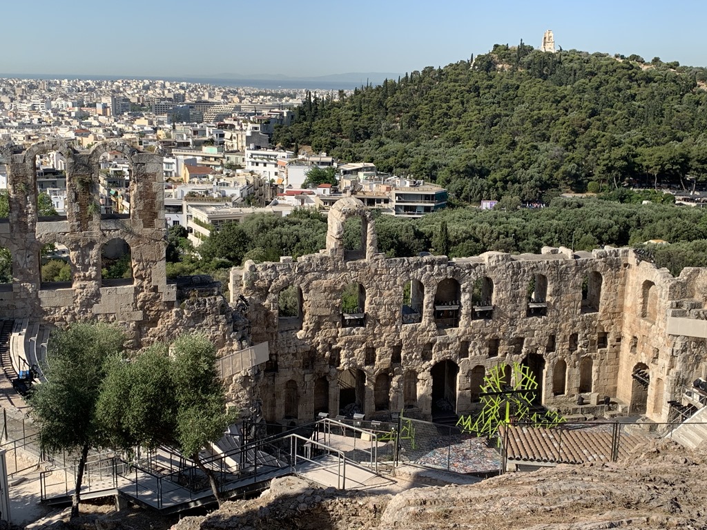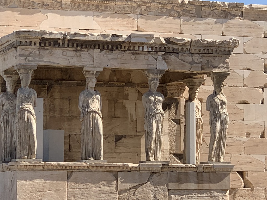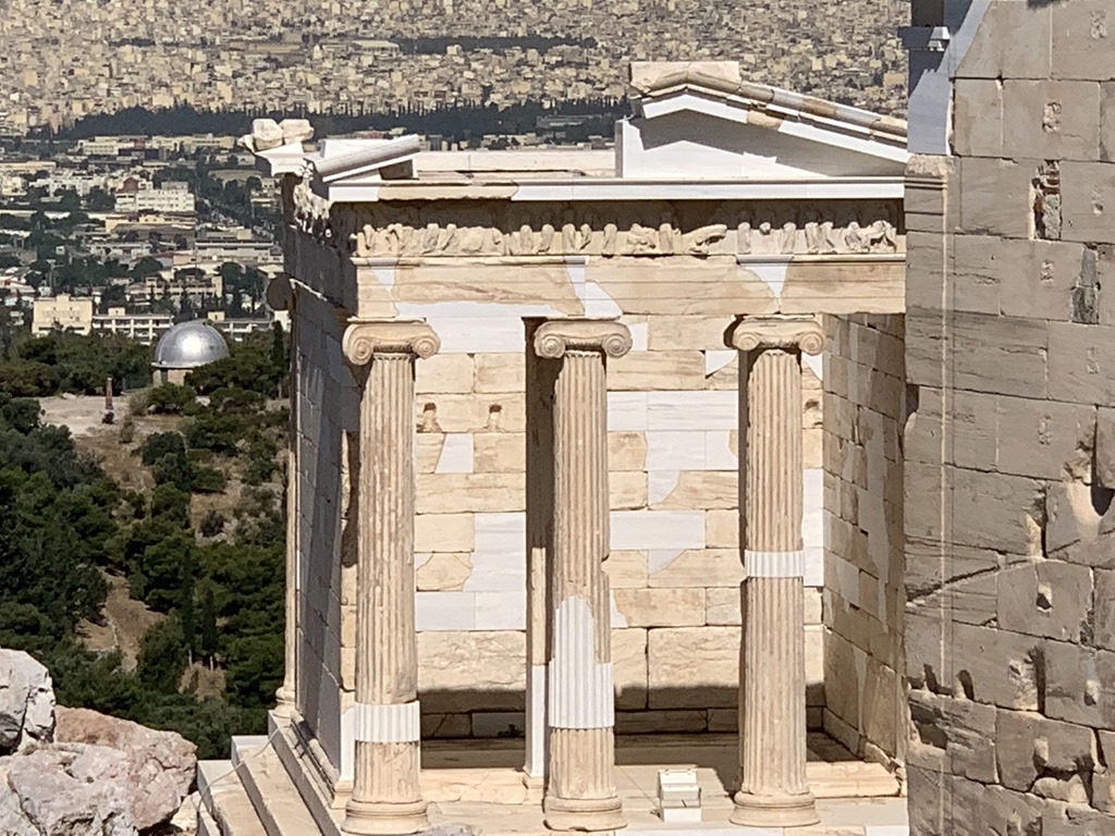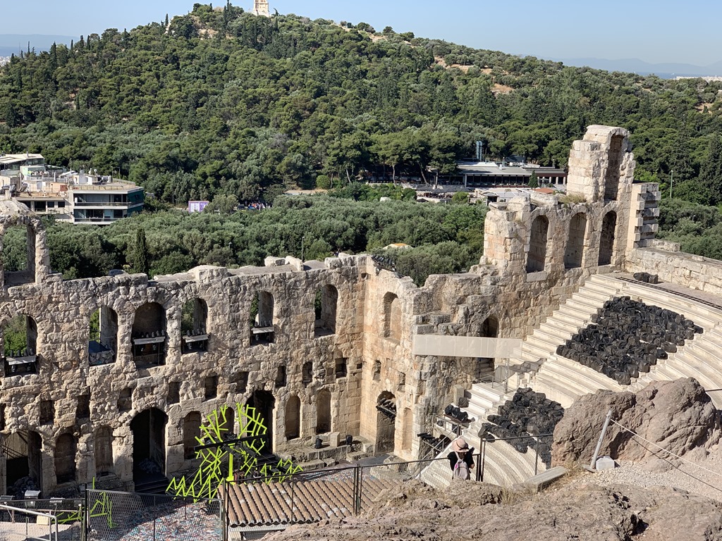 The Parthenon sits at the highest point of the Acropolis, 230 feet above the city. It was built to honor the goddess Athena and has been the model for thousands of buildings throughout the world. There are some columns on display with the center hole visible. Lead was used in these cavities to stabilize them. Elaina explained that the historians have evidence that the way the columns and blocks were brought to this high point in the city was to use trees as rollers with the blocks or pieces of the columns on top and then roll them up the hill. Painstaking work I would say, but the results are impressive all these centuries later. Restoration work is constantly in progress as you can see from the iron bars.