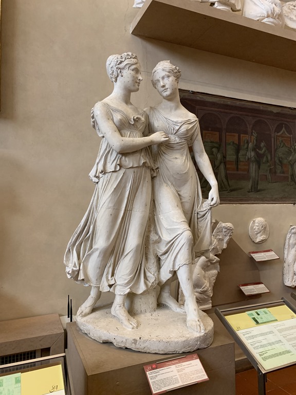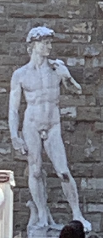 And the David is just amazing. Michelangelo studied cadavers to get every detail just right. Antonella was so helpful as we studied this sculpture – she pointed out aspects such as the facial expressions that we might not have noticed in the same way. The sculpture was outside for 300 years before it was moved. There was damage to one finger and a wrist which was repaired. There is now a replica in the spot outside where this original once stood.