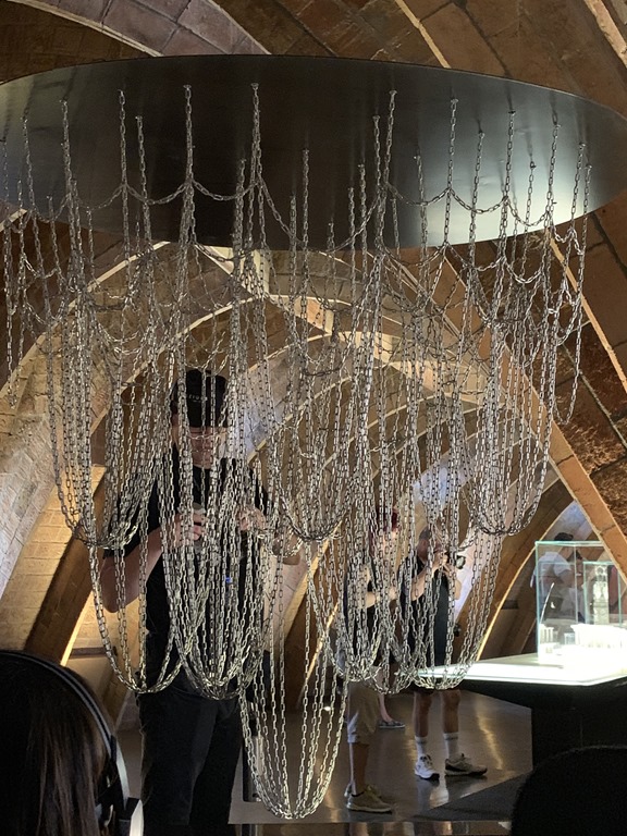 The attic was next. Here is where laundry used to be washed and dried. It consists of 273 flat brick arches arranged to resemble the interior of the Biblical whale. This area also contains a display of his work. Here is a model of the design of the building – which he designed upside down. You can see it right side up in the mirror below it.