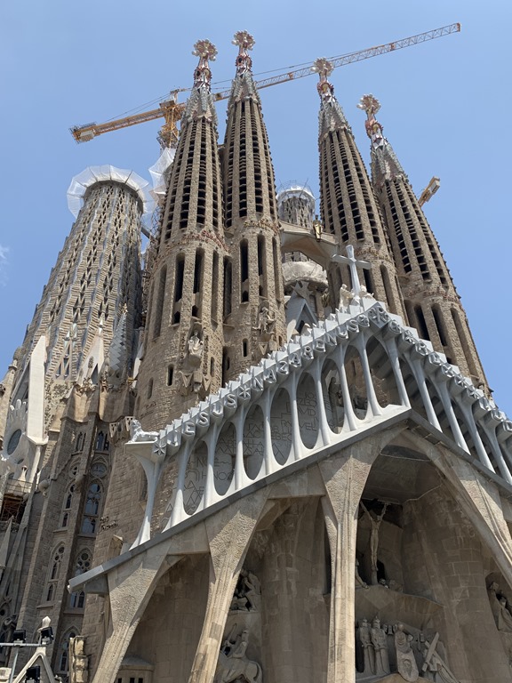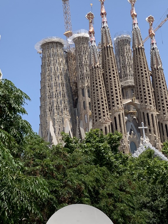 Today we wanted to see more of the Gaudi influence in Barcelona. We have already visited the Sagrada Familia twice before, once when it was really unfinished (no roof, etc.) and then two years ago when it was amazing to see. It was begun in 1882 and is still unfinished! So this time our sights were on La Pedrera and Parc Guell. Here are some pictures of the outside of the Sagrada Familia though, the first from a distance as it towers over the city and is its most distinctive landmark.
