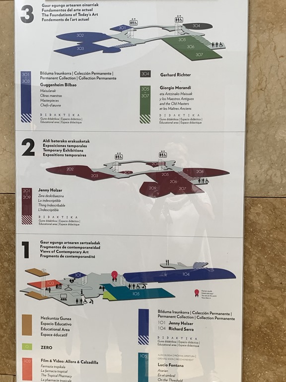 There is a permanent Jenny Holzer exhibit and also a temporary exhibit. The permanent one is a cascade of words in English, Spanish and Basque. Her work is all in words and can be quite provocative. We couldn’t take pictures of the ones inside the galleries but the permanent one is in the lobby of the museum.