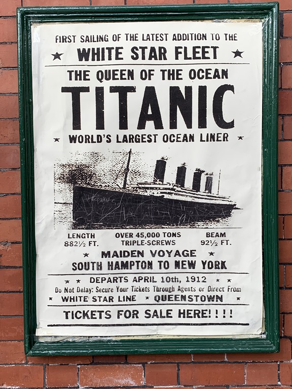 Last time we were in Cobh, we went to the Titanic Museum. Cobh was the last port of call for the Titanic before it sailed into the Atlantic. We did the whole Titanic experience last , from Belfast where the museum is a start to finish experience, to Cobh to the cemeteries in Halifax.